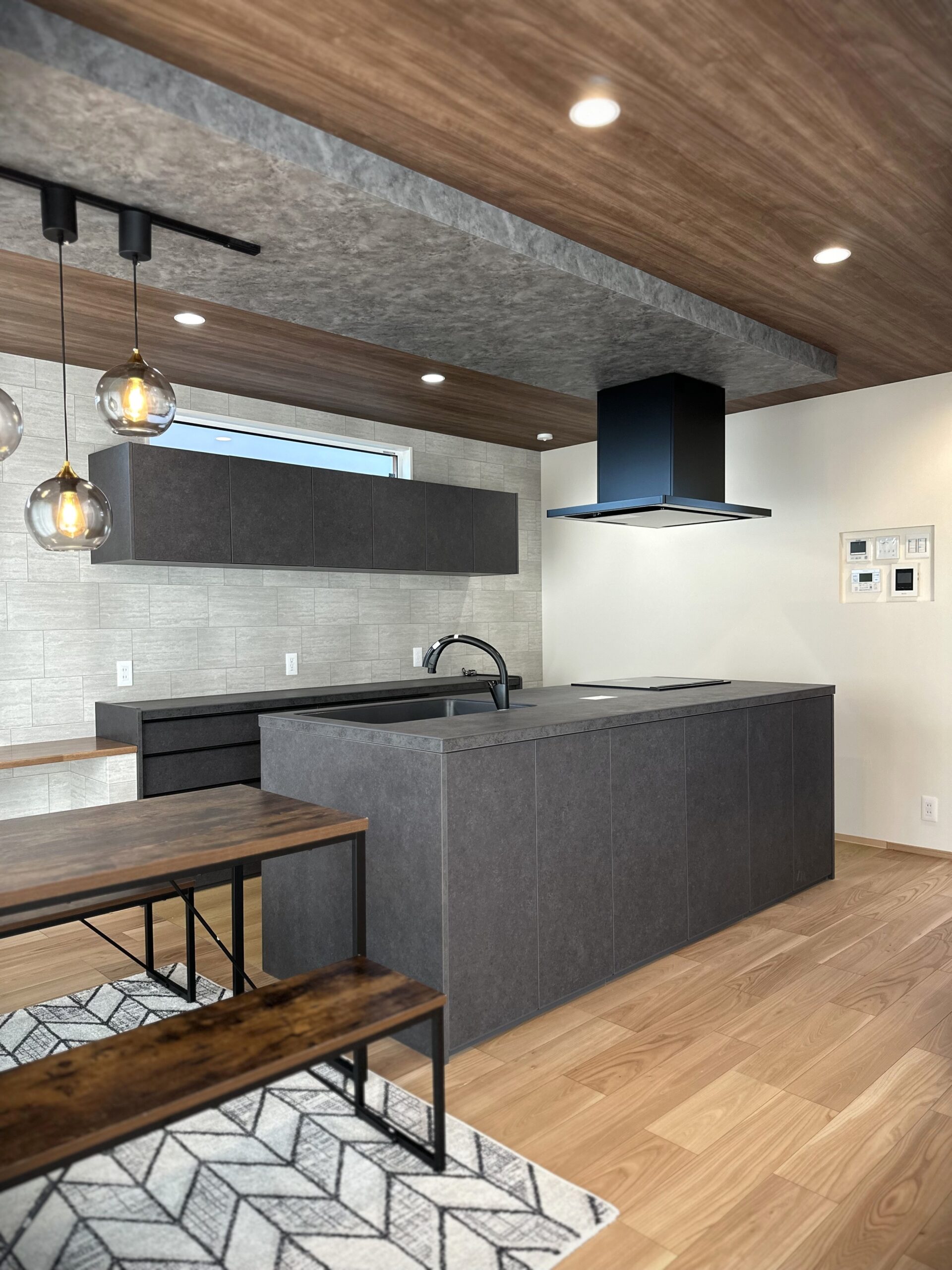 ブラックの造作カウンターと棚が大人っぽさを引き立てます