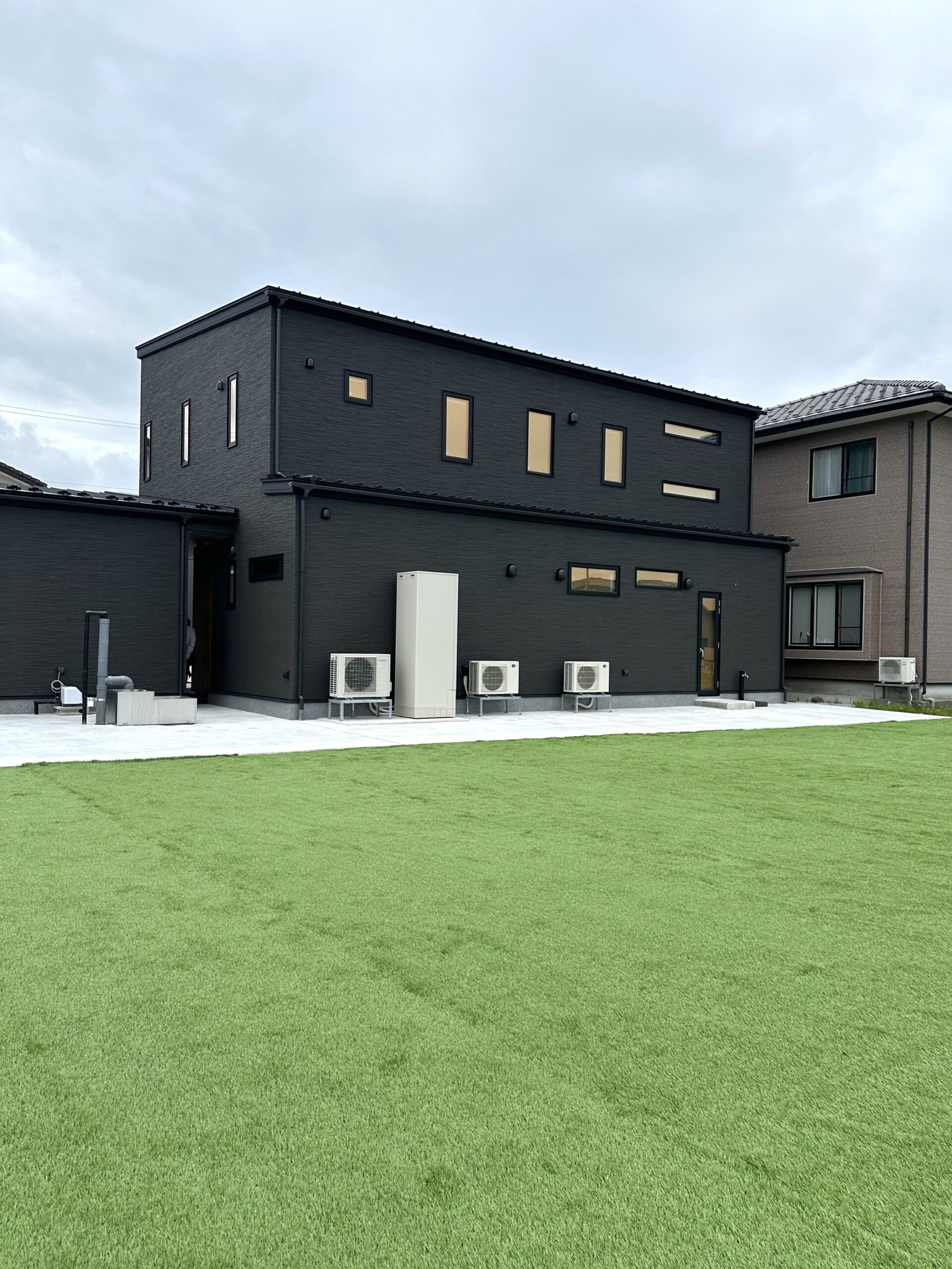裏庭には人工芝を敷き家族みんなでのびのびできる空間に