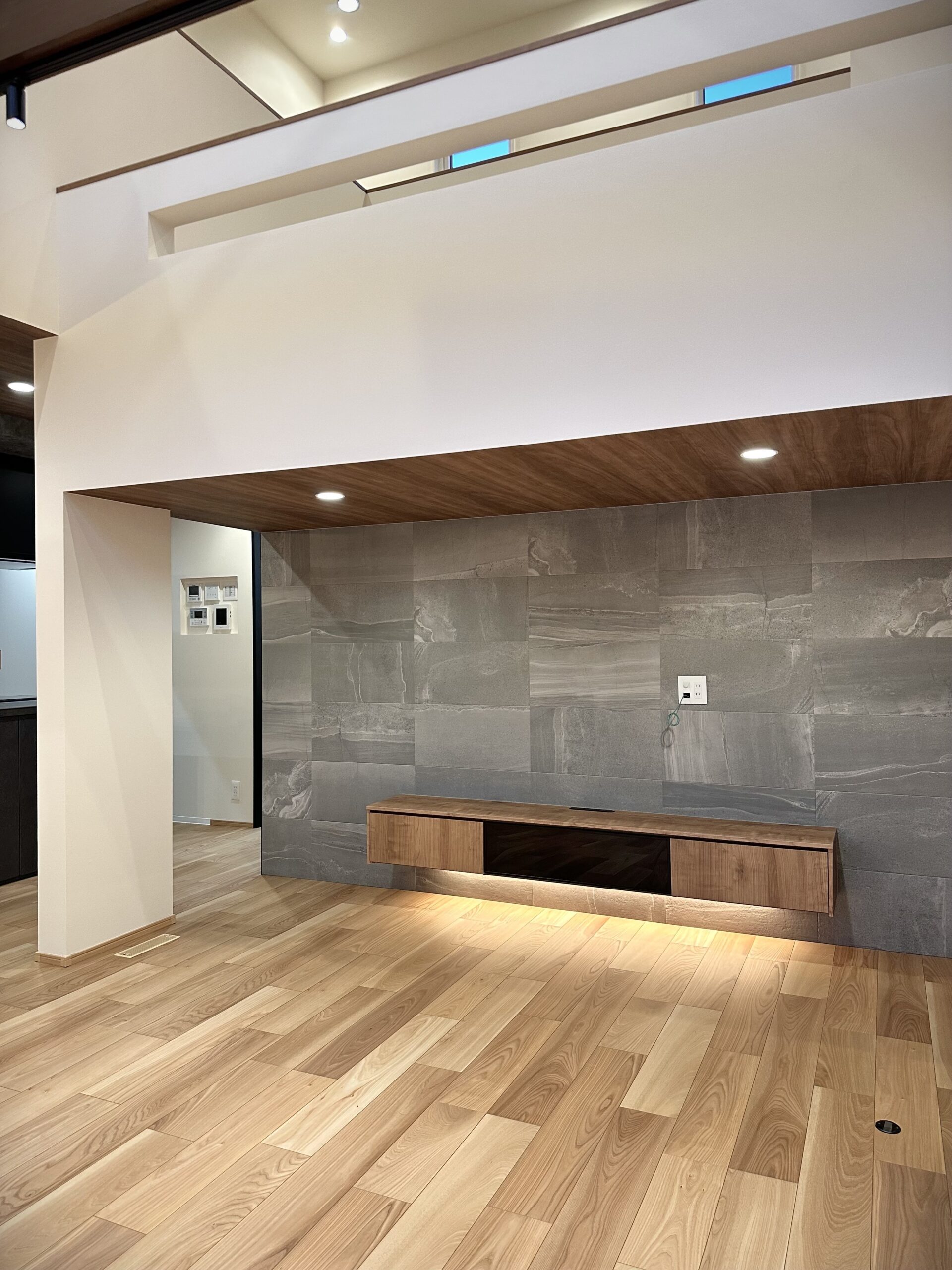 テレビボード下には間接照明を取り入れ浮遊感を演出