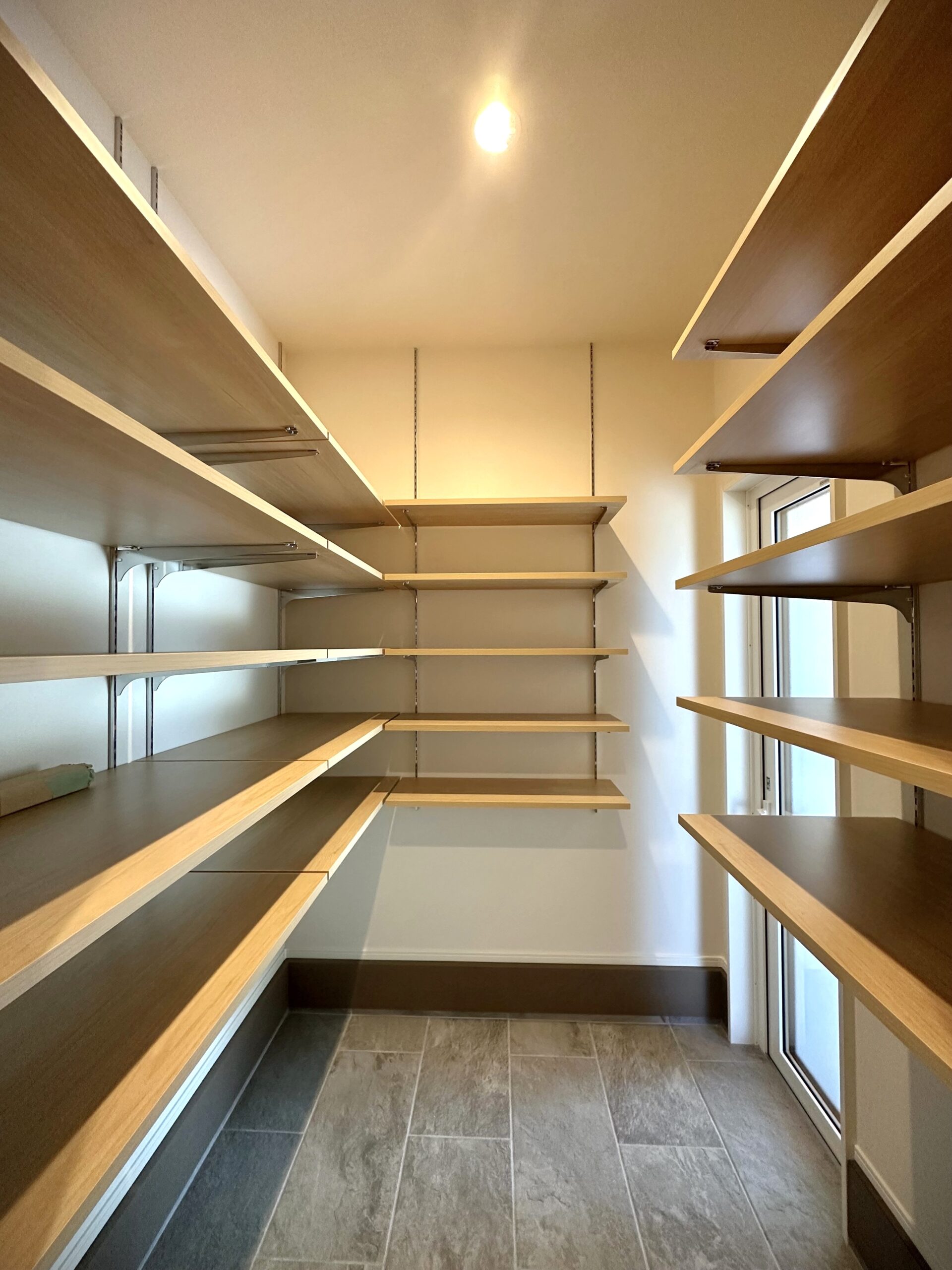 パントリーは出入り口を二つ設けたことで、ペニンシュラキッチンでも回遊できる動線を実現