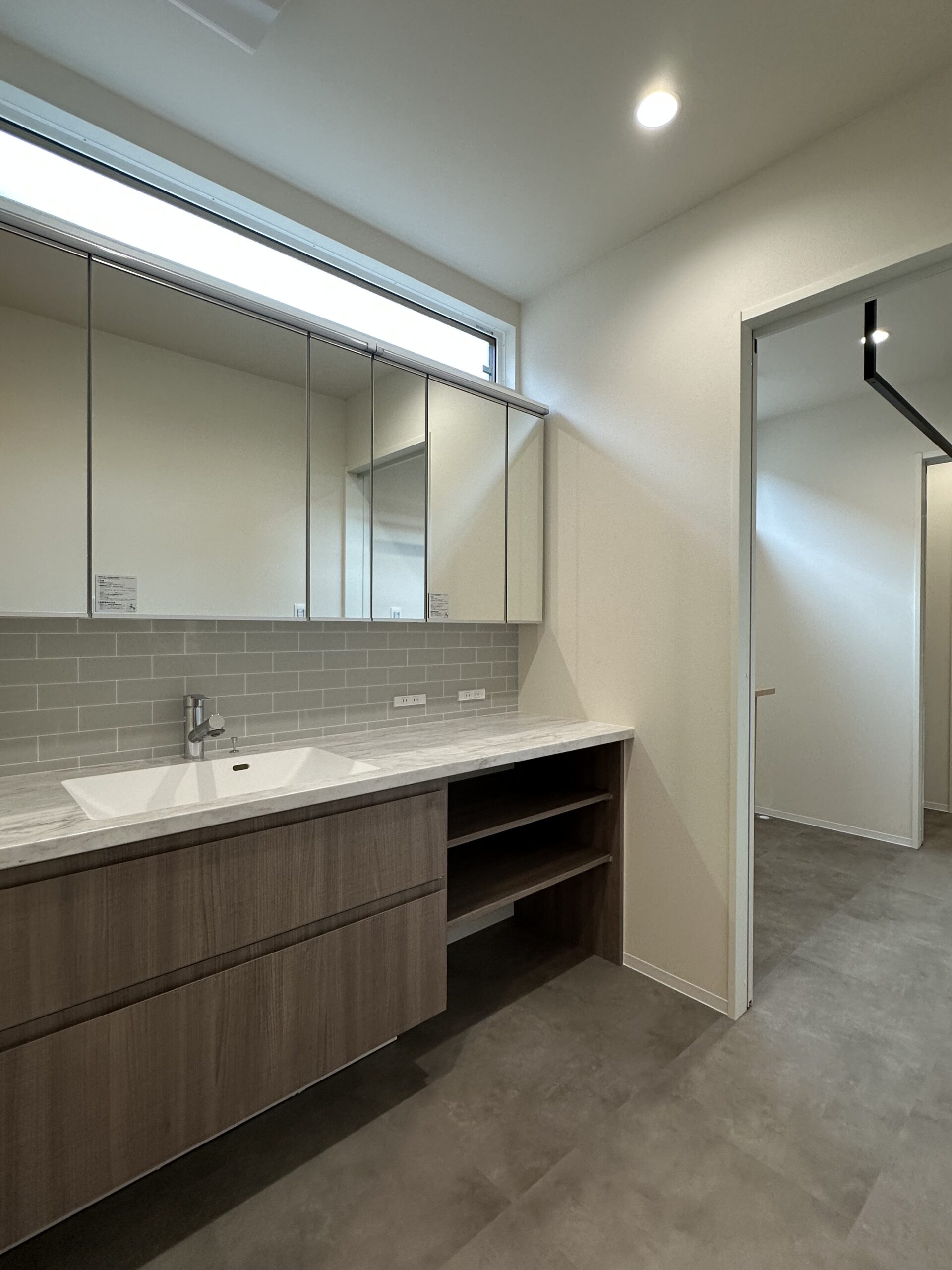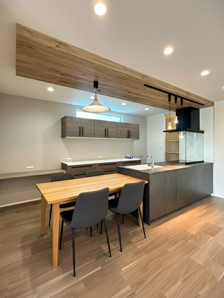 やわらかな光と木目の質感が調和するLDKは、家族が自然に集まり心地よい時間を育む空間。 そこからつながるキッチンは、水まわりや収納へとスムーズにアクセスでき、日々の家事を効率よくサポートします。 無駄を省いた動線設計が暮らしにゆとりを生みシンプルな中に上質さを感じられる住まいとなりました。 光と木が織りなす心地よさを、この完成見学会でぜひご体感ください。