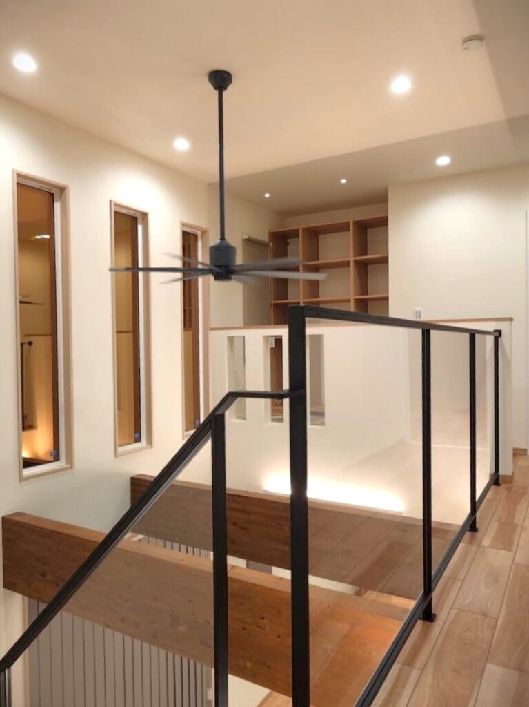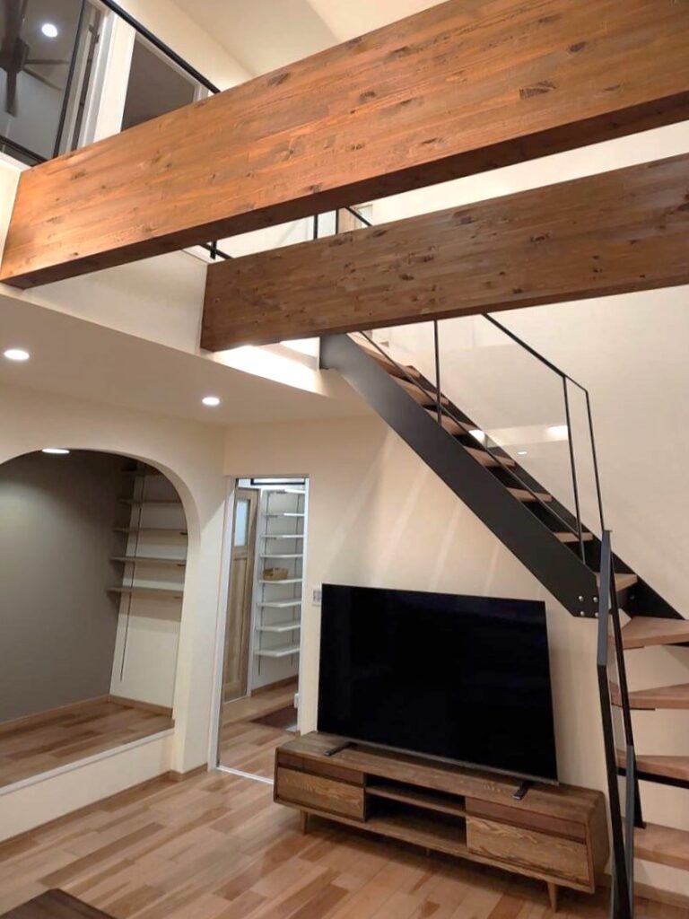 開放的な吹き抜けリビングにはリラックスできる小上がりも