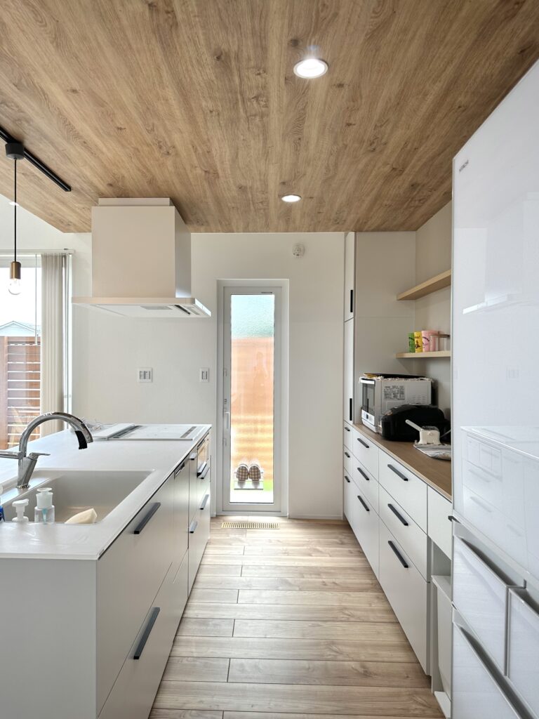 キッチン背面のクロスがホワイトをより引き立てています