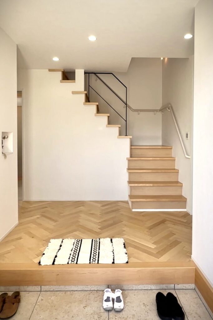 リビングまでのホールはヘリンボーン床を採用