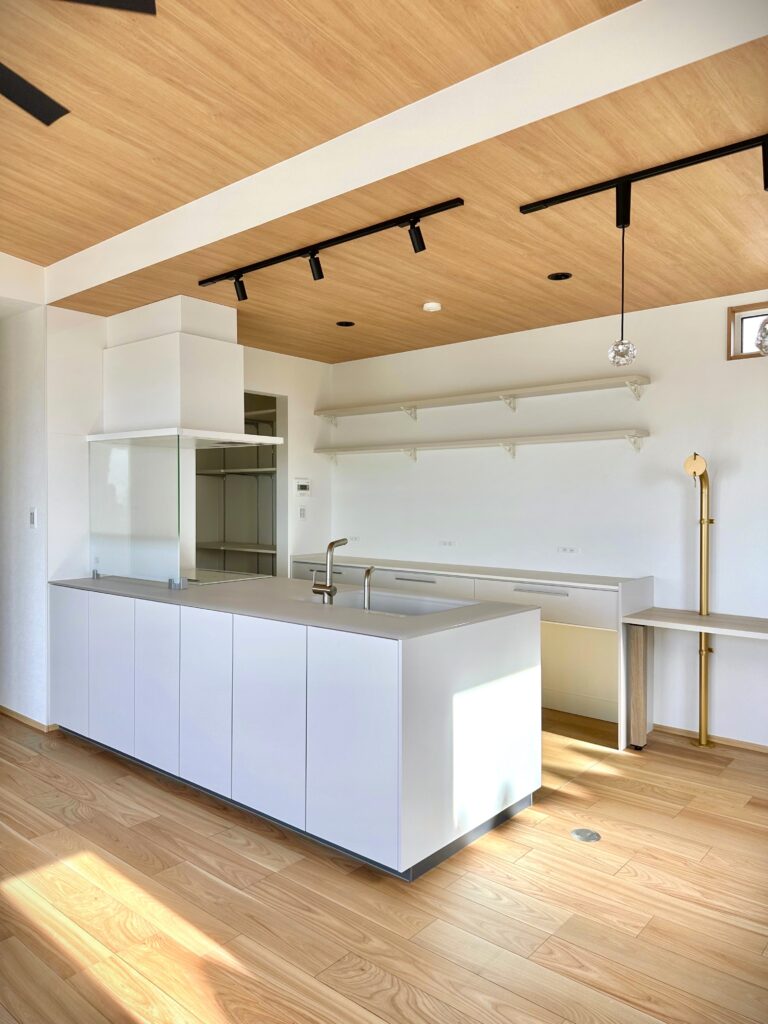 真っ白なⅡ列型キッチンがリビングに映えます。