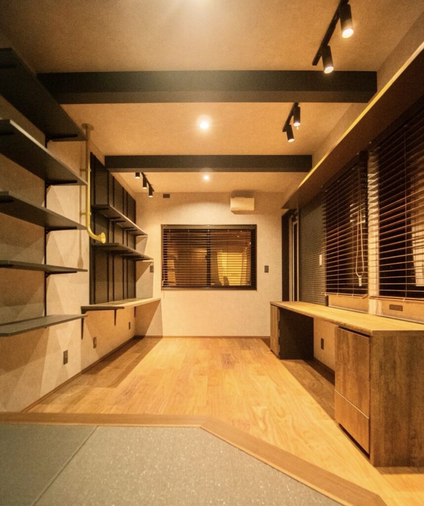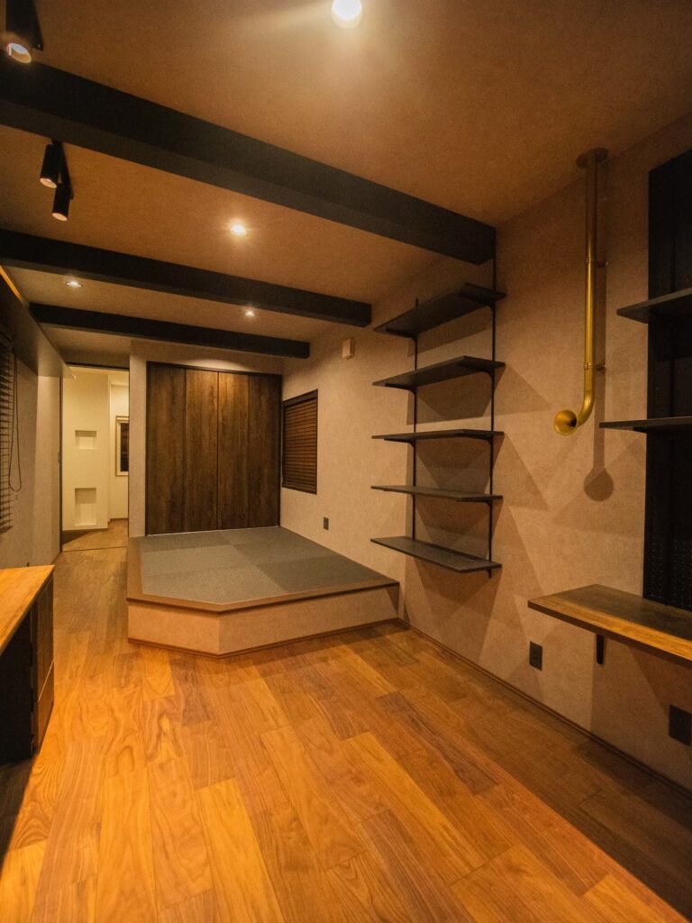 木目調の造作と小上がりを取り入れた一階趣味部屋
