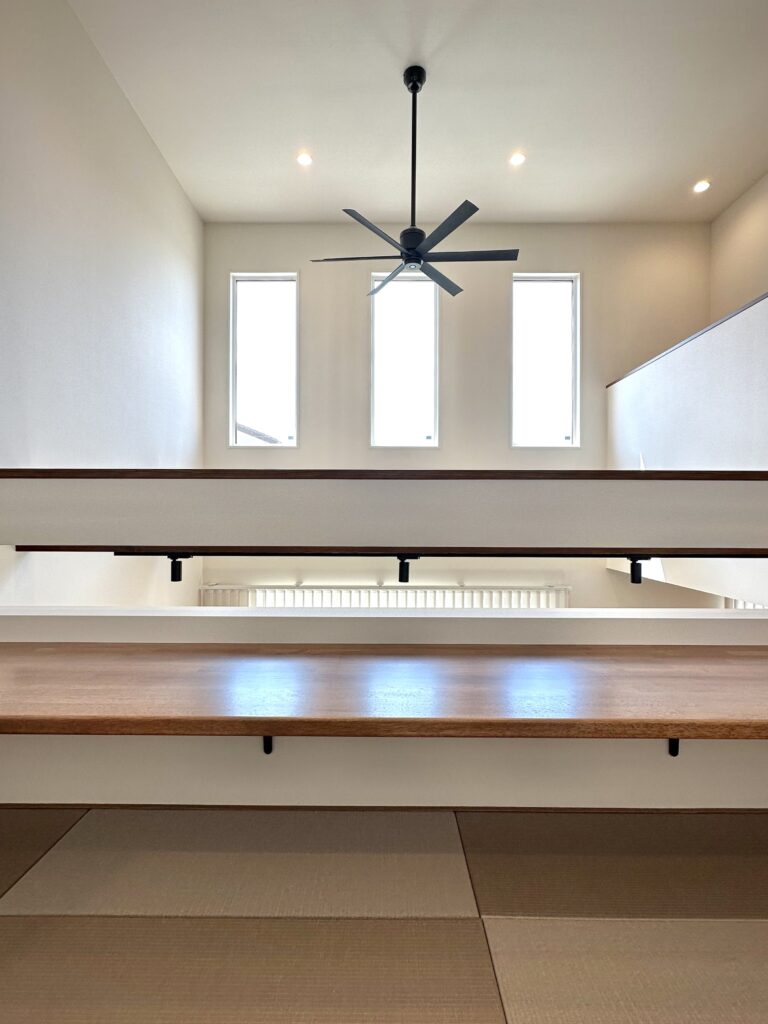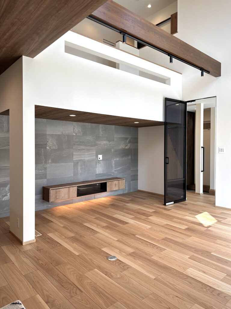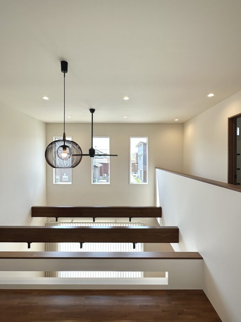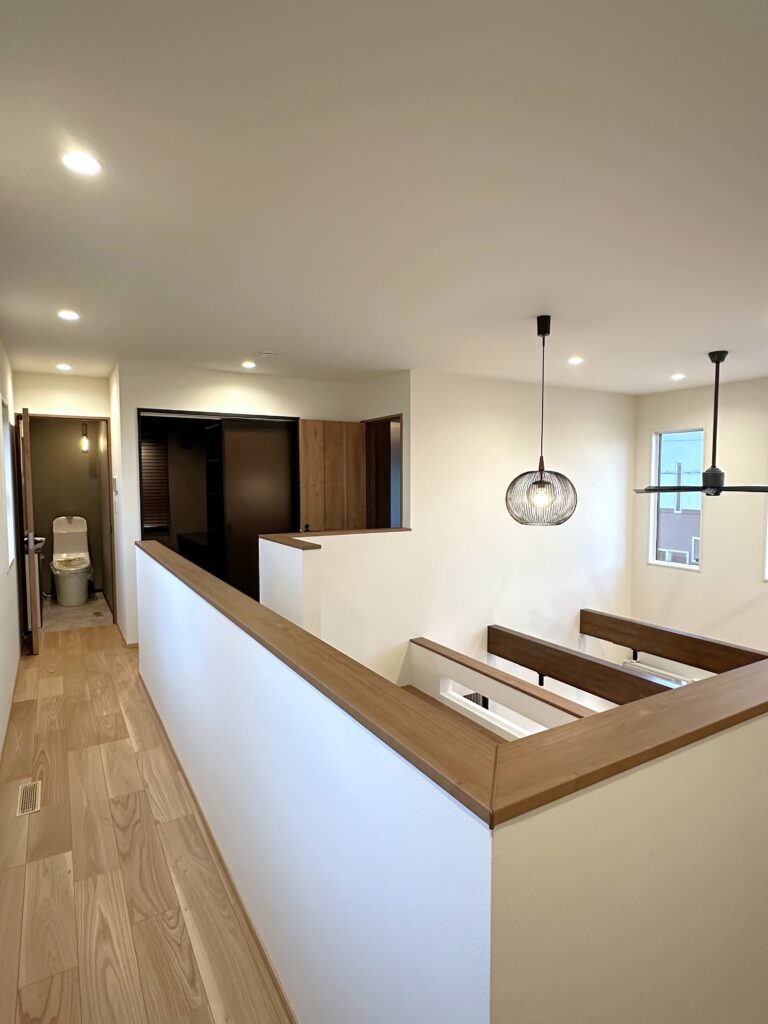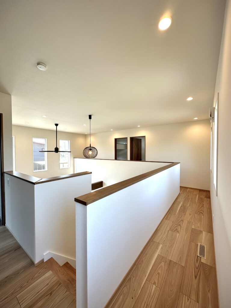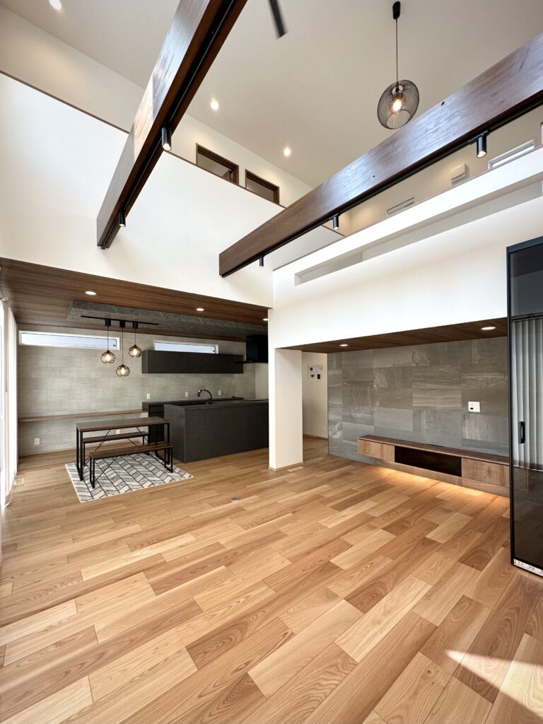 LDKは吹き抜けで開放感たっぷりで家族の気配を自然に伝えます。