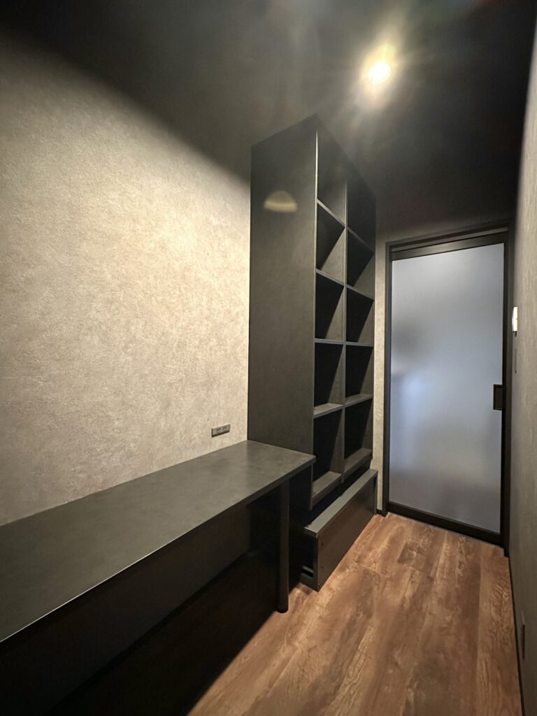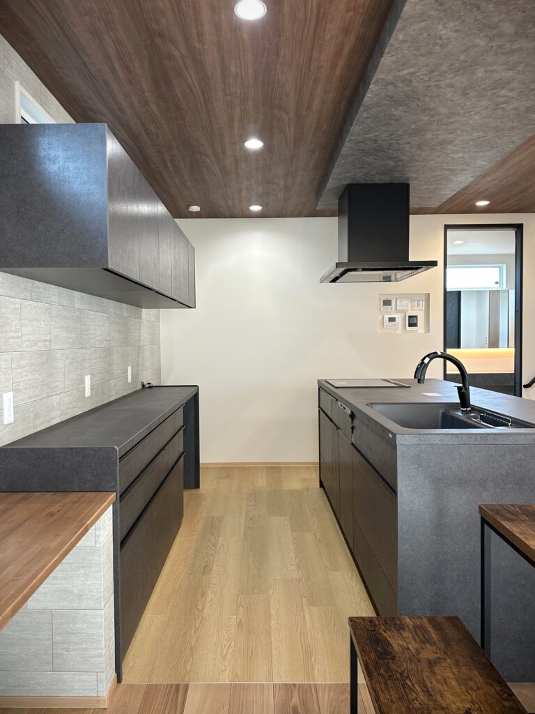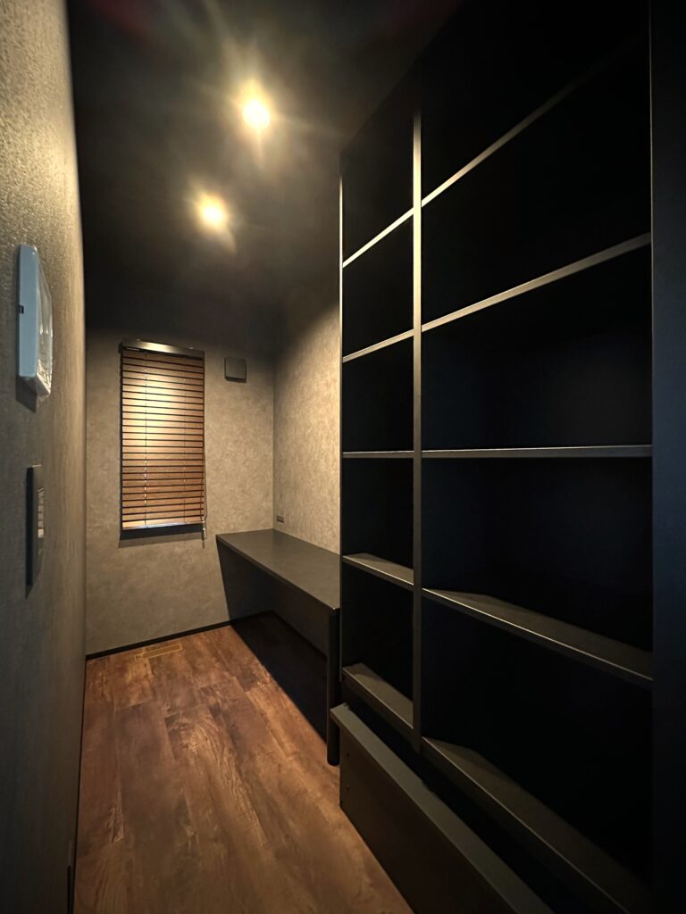 ブラックの造作カウンターと棚が大人っぽさを引き立てます