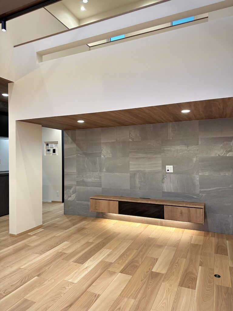 テレビボード下には間接照明を取り入れ浮遊感を演出