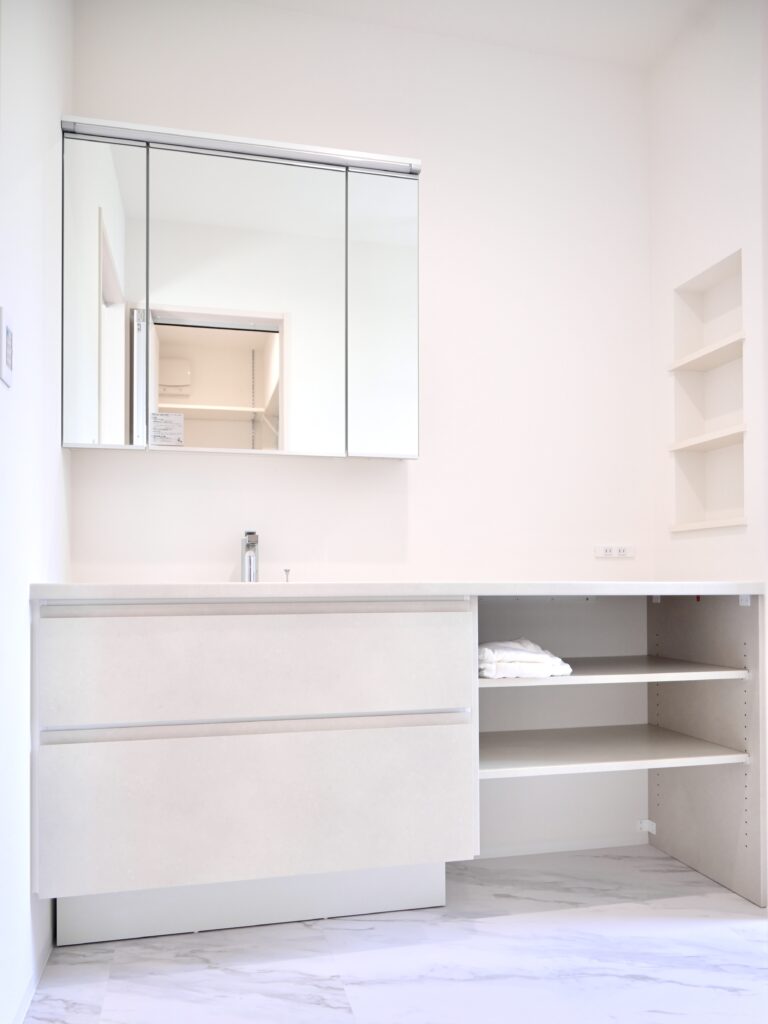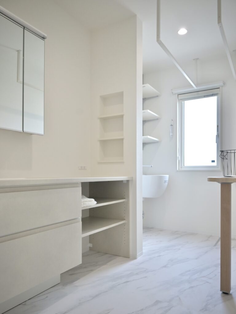 洗面スペースとランドリースペースを一体化させた事で物干しスペースをたっぷり確保