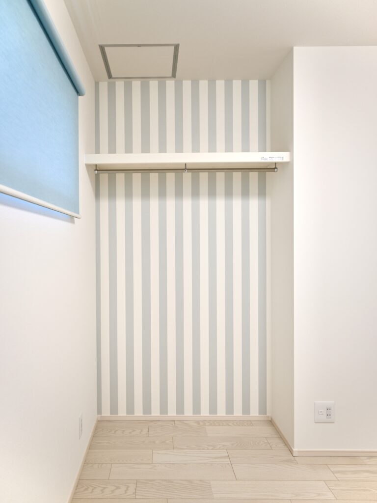 扉のないクローゼットにはストライプのクロスを取り入れました