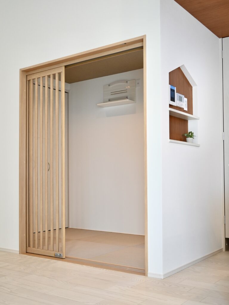 左側一面には収納スペースを設け、その分お部屋の広さを確保