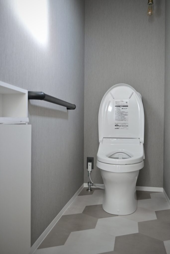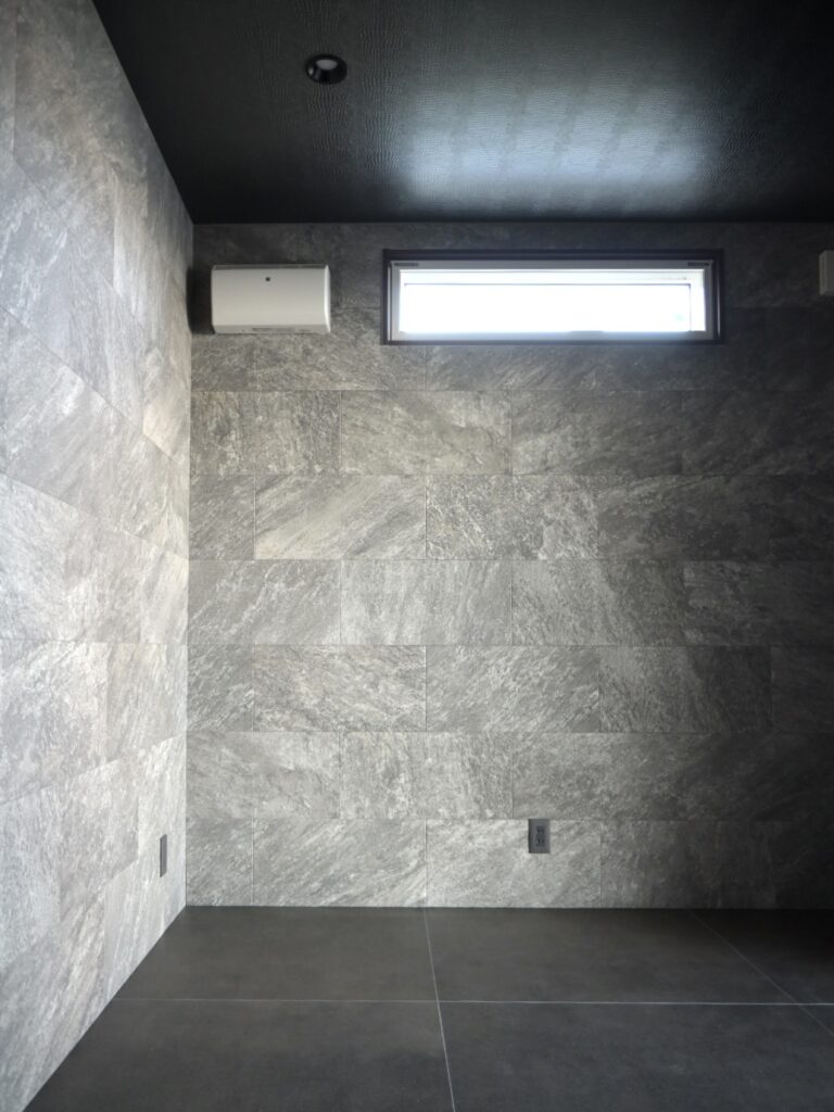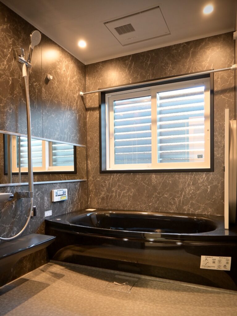 ブラックの浴槽と壁柄で高級感のあるバスルームに