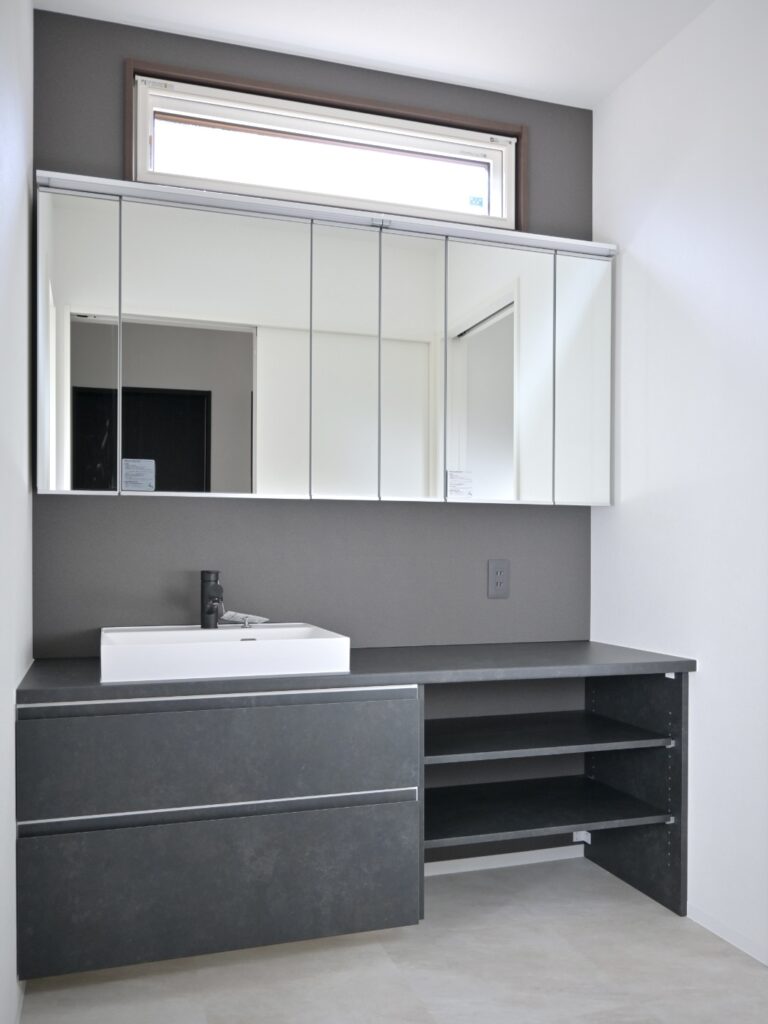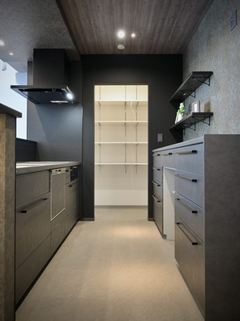 キッチン裏に続く水回りは一直線で動きを最小限に抑えました