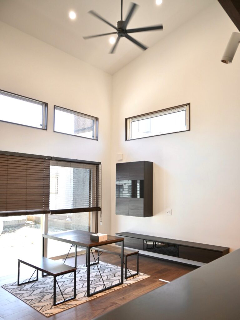 玄関入ってすぐの開放的な吹き抜けリビングに