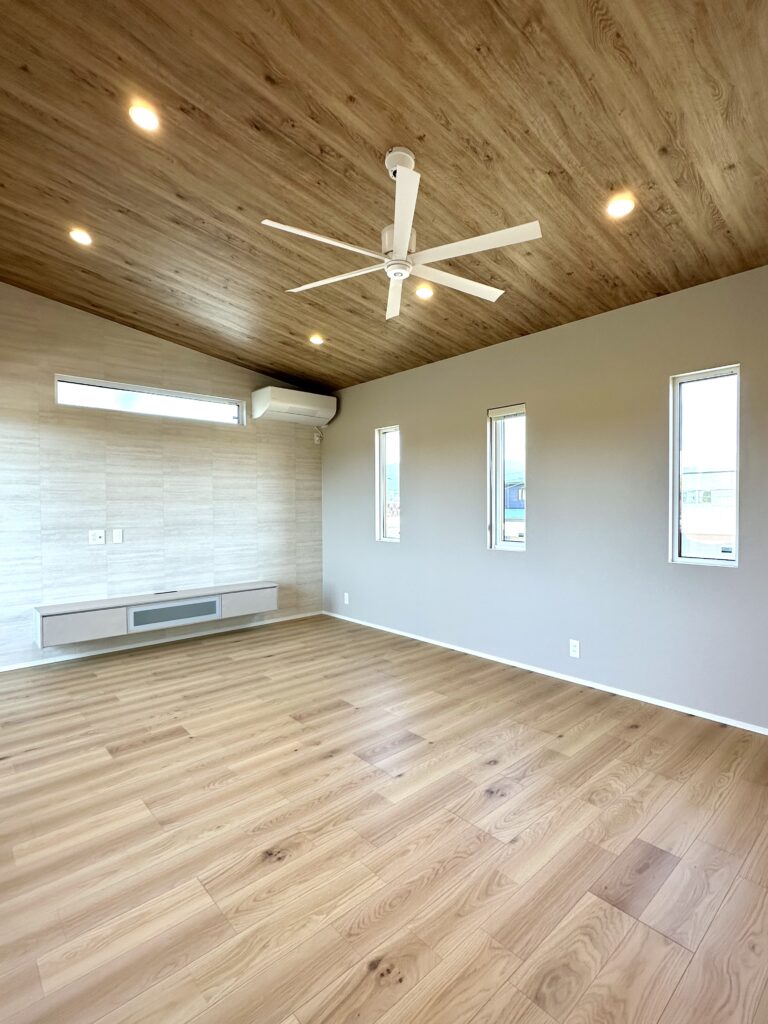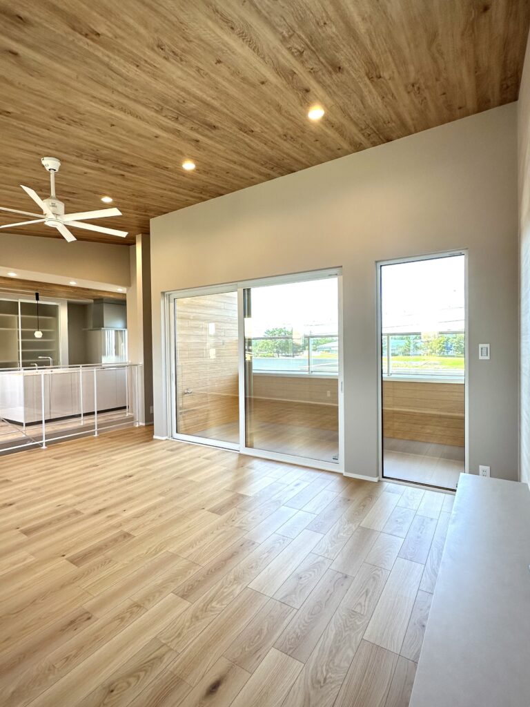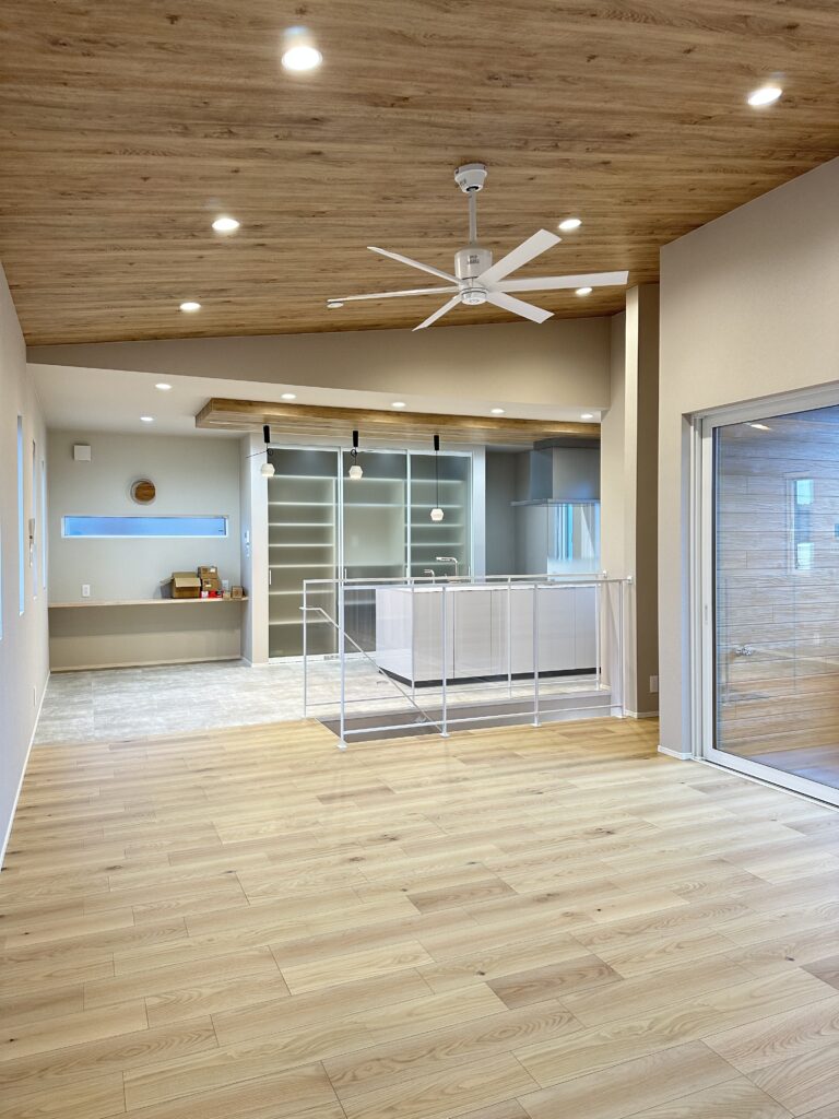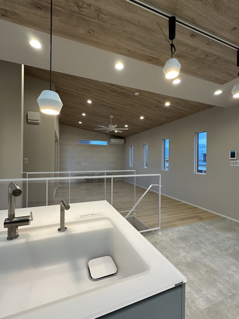 また二階リビングの天井には勾配天井を採用し空間に広がりと開放感を。