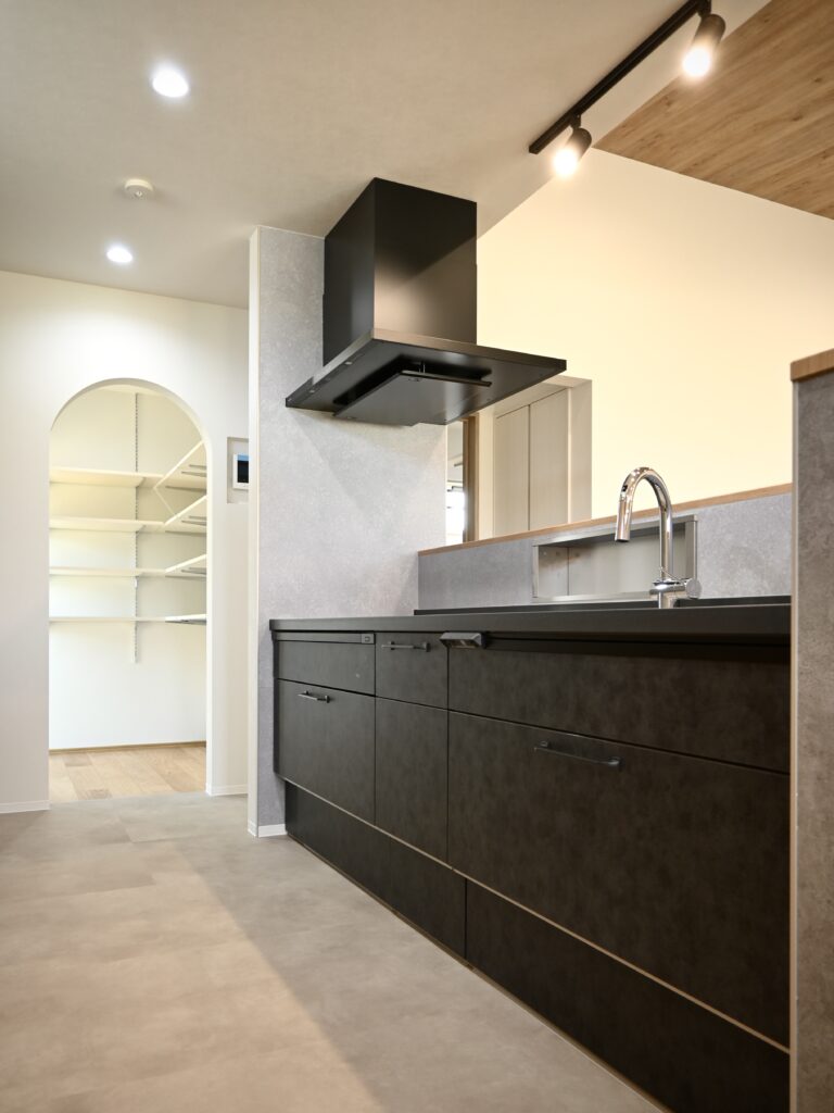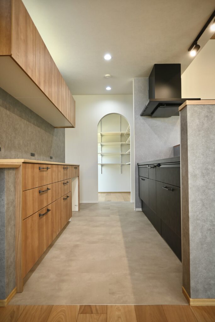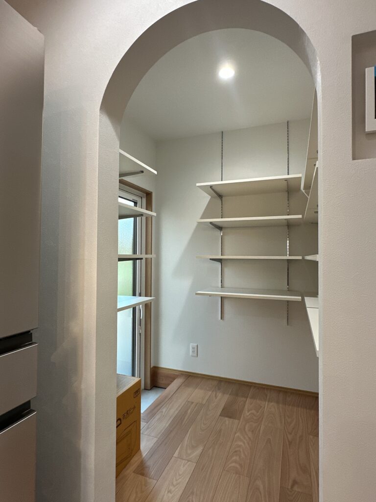 アーチ壁の向こうはパントリー、そして勝手口へ続いています
