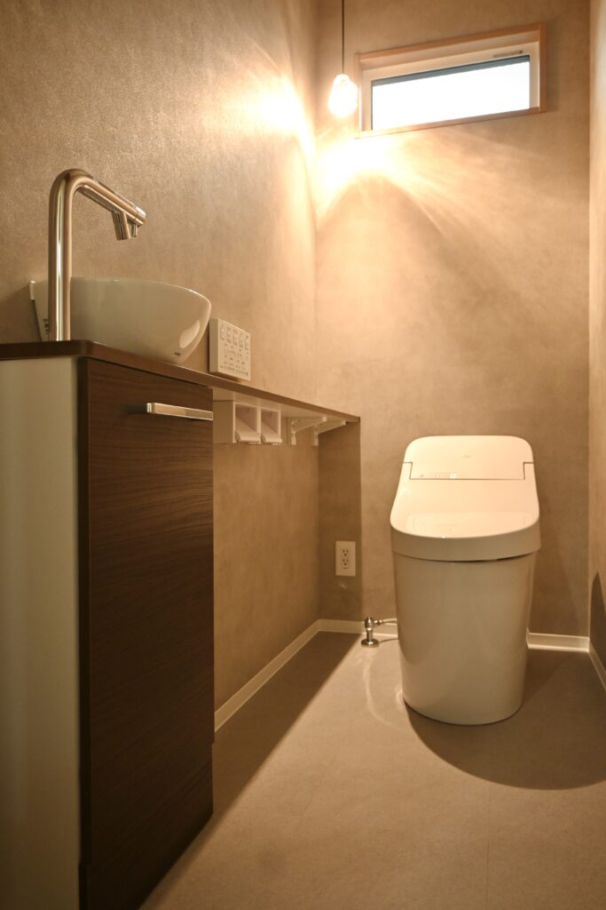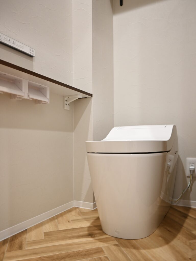 トイレ床はヘリンボーンでかわいらしさと温かさを