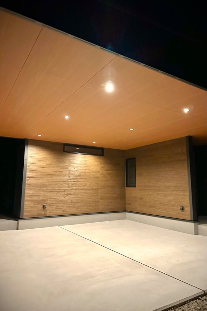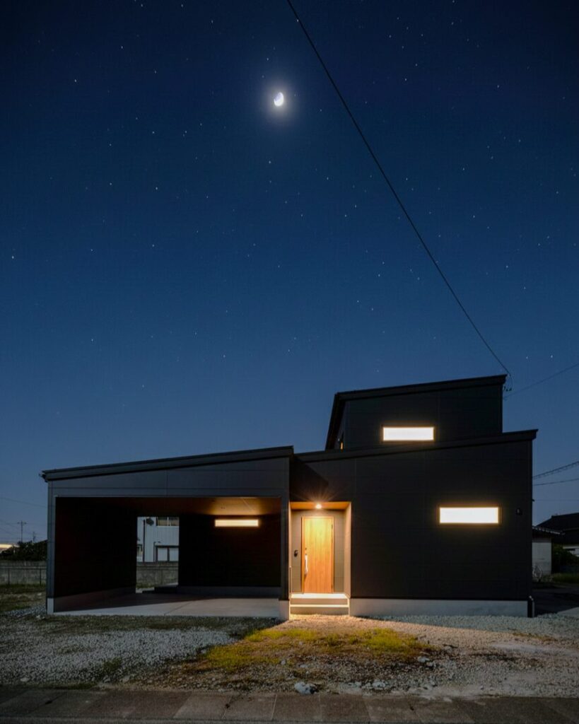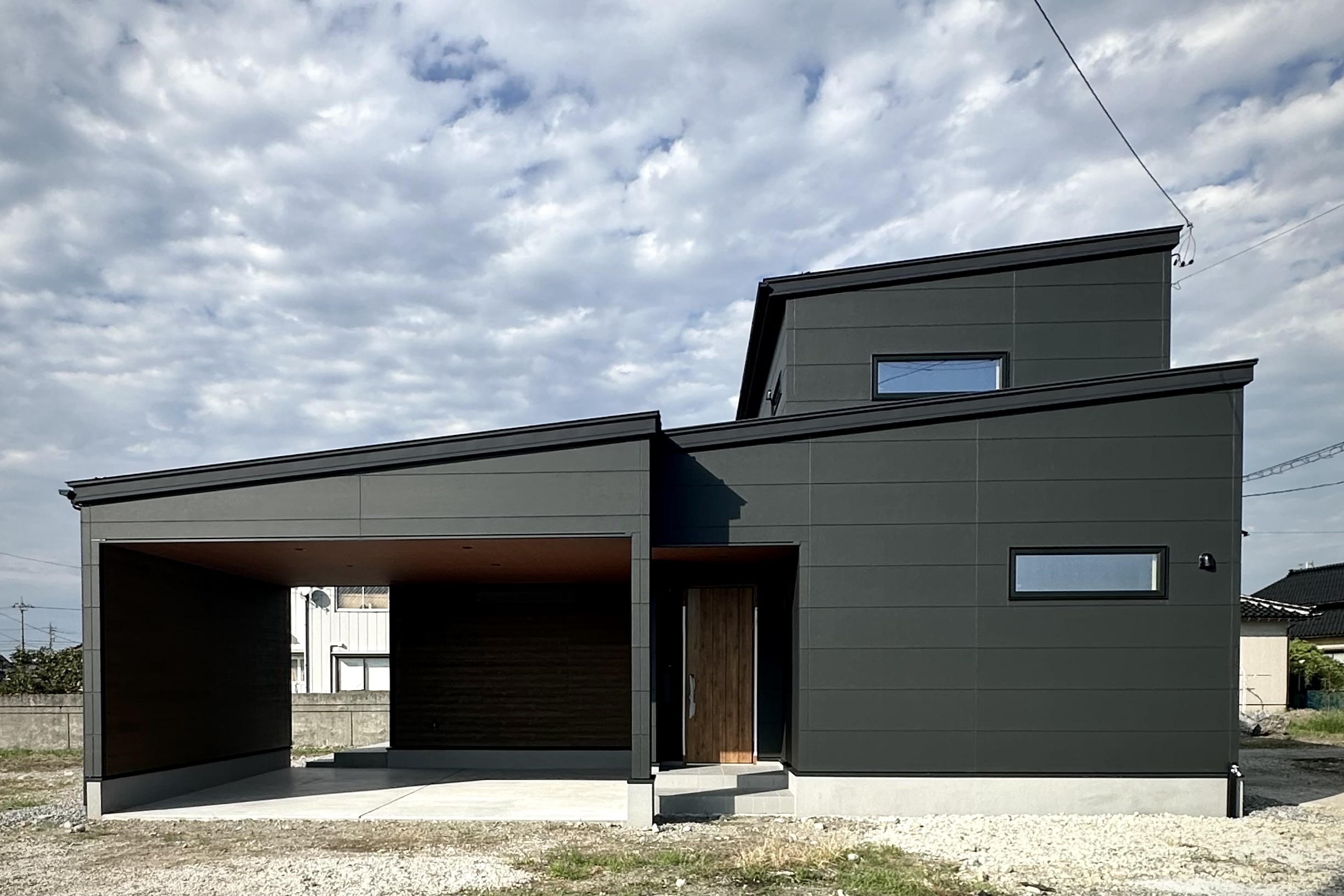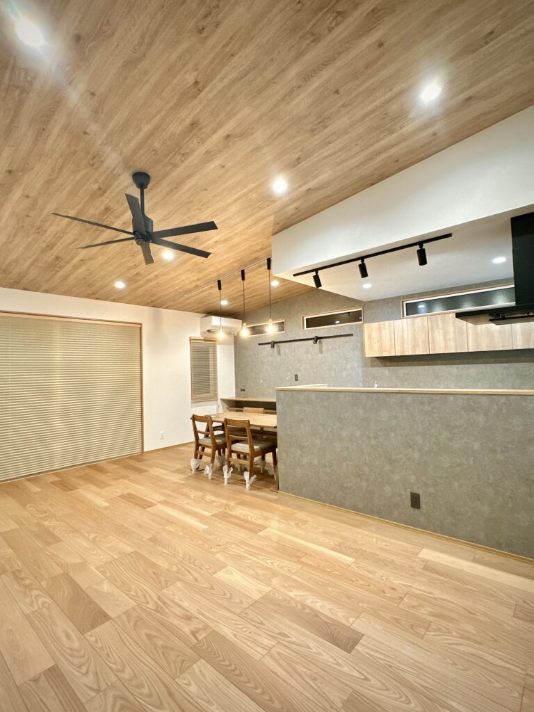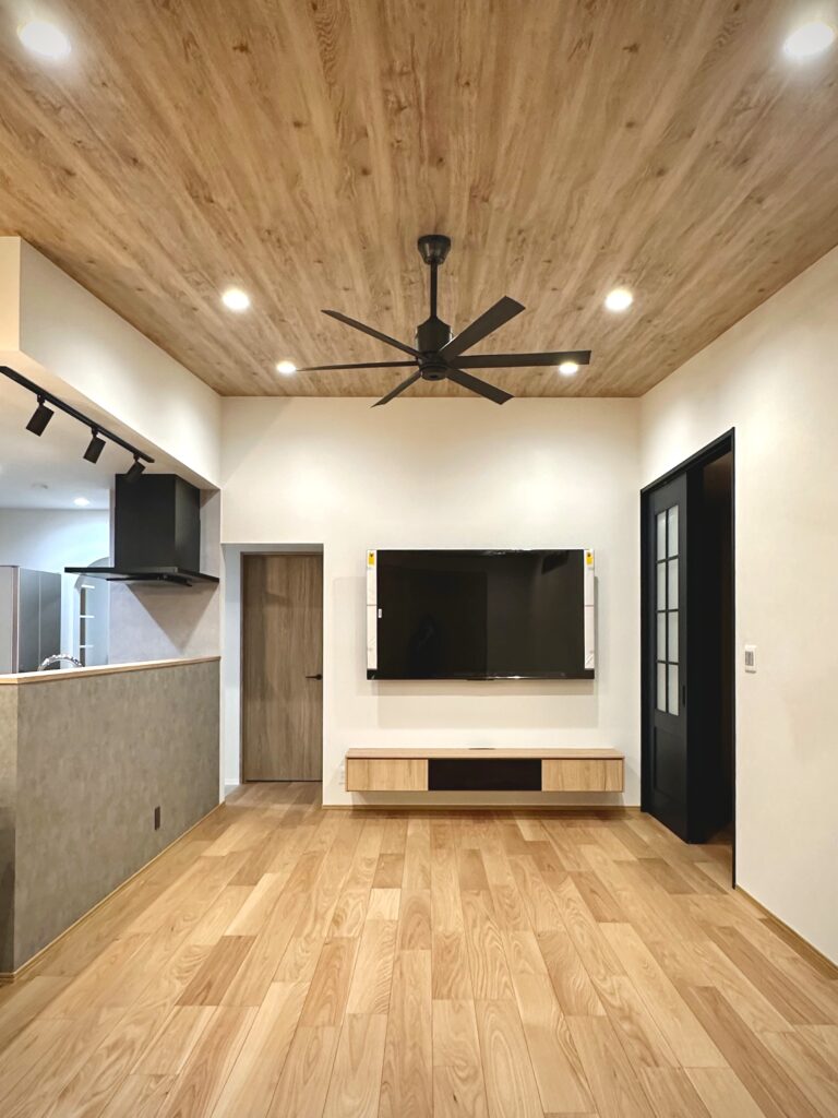 家族が一番集う場所、リビングの上部は屋根の形状を活かした勾配天井で圧倒的な開放感とあたたかさ。