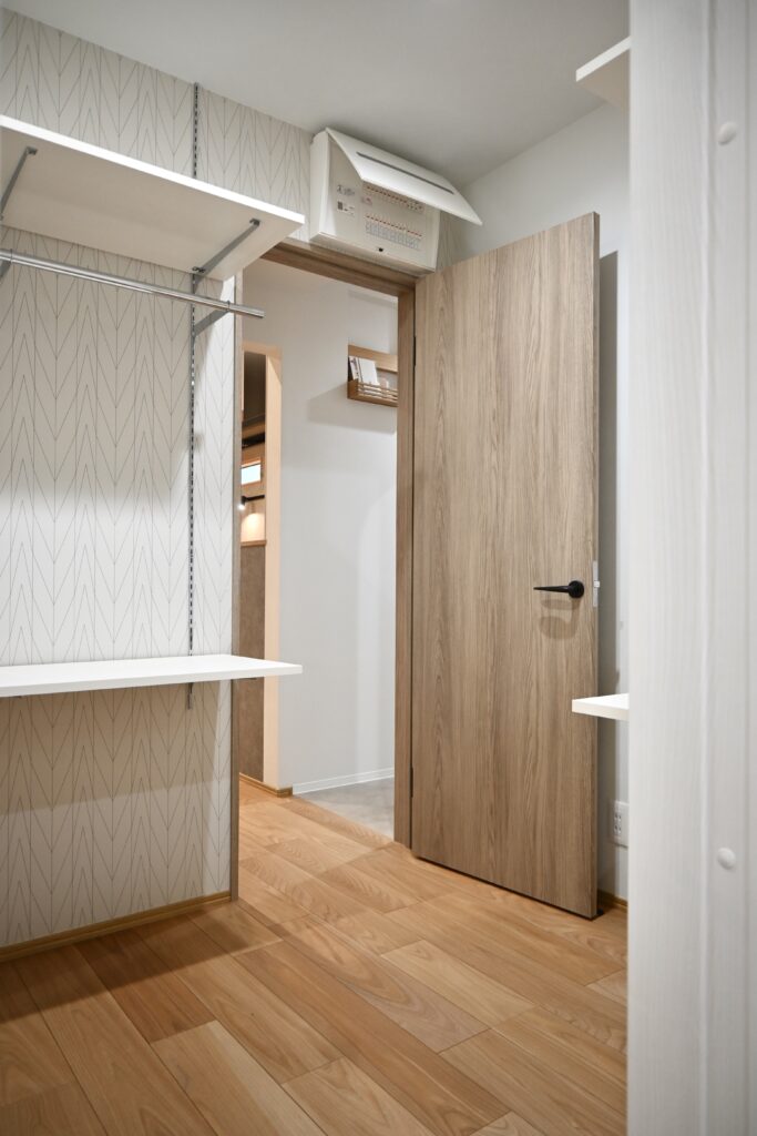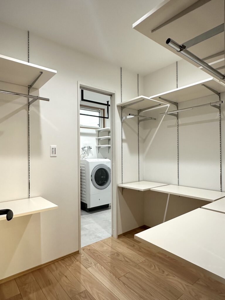洗濯して乾いた衣類は向かいのクローゼットにささっと収納できる家事ラクな間取り