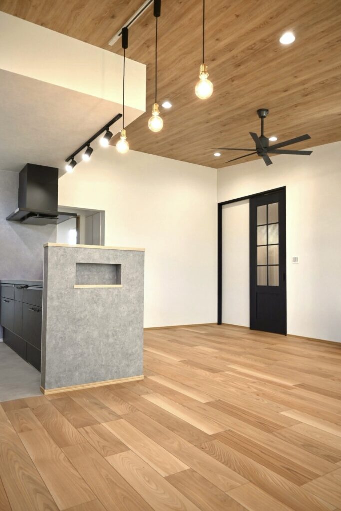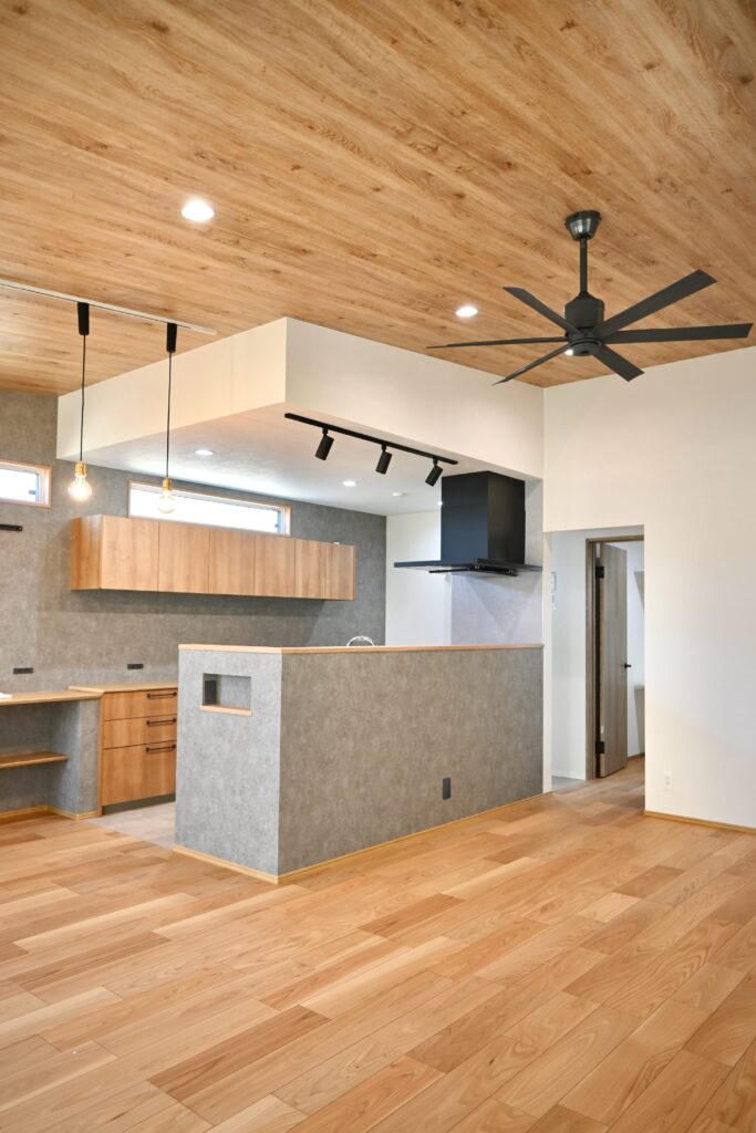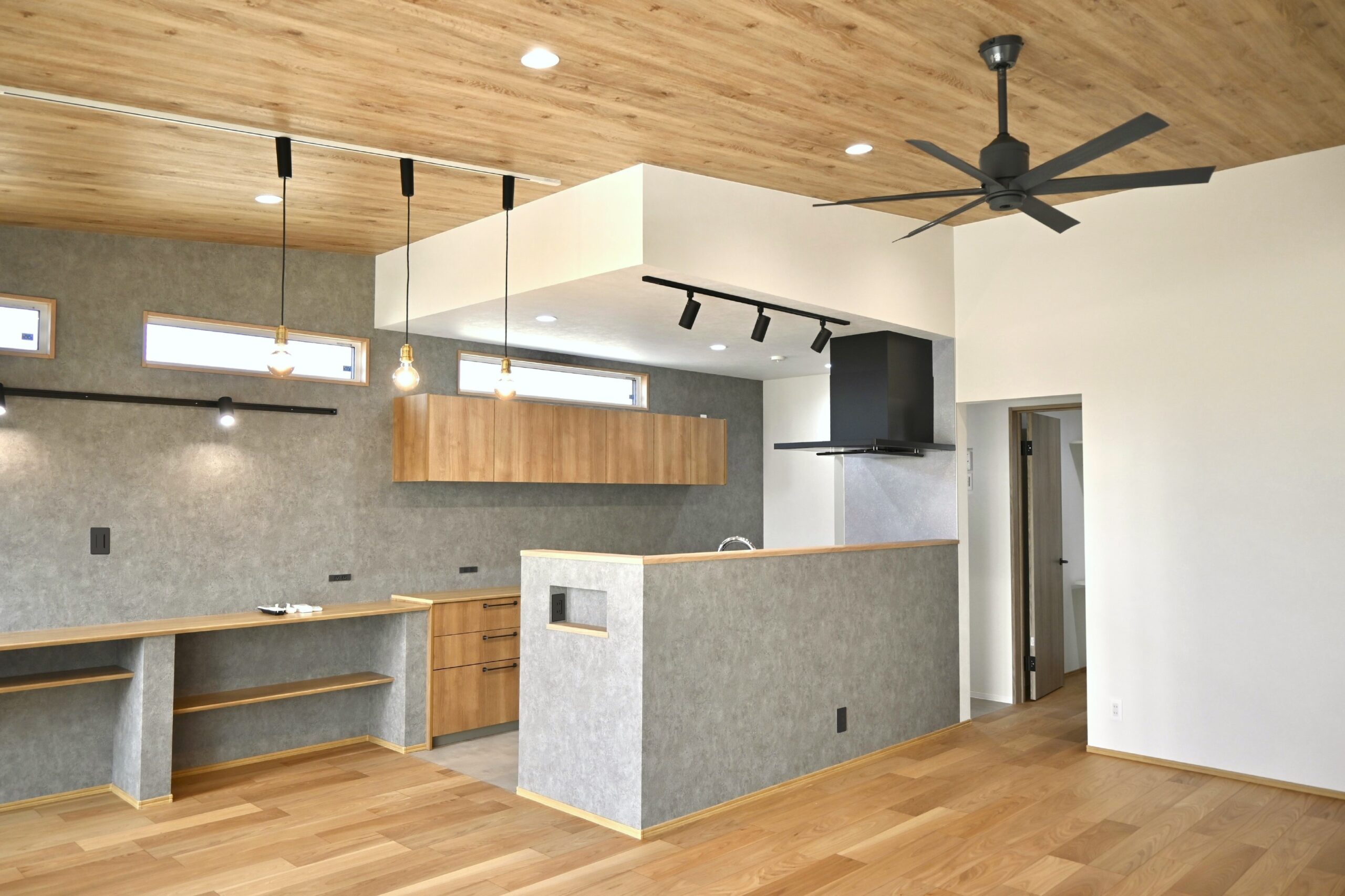キッチン周りは木目×グレーの組み合わせで温かさを残しつつも落ち着きのある雰囲気に