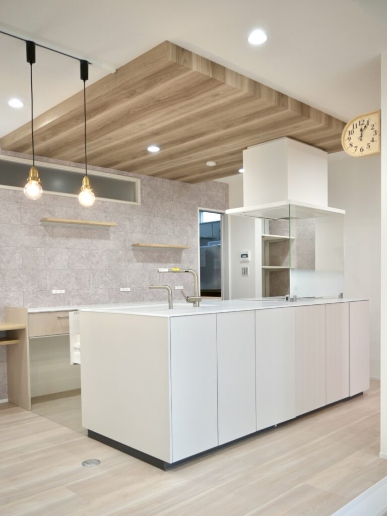 ホワイトでまとめた対面式キッチンは清潔感があります