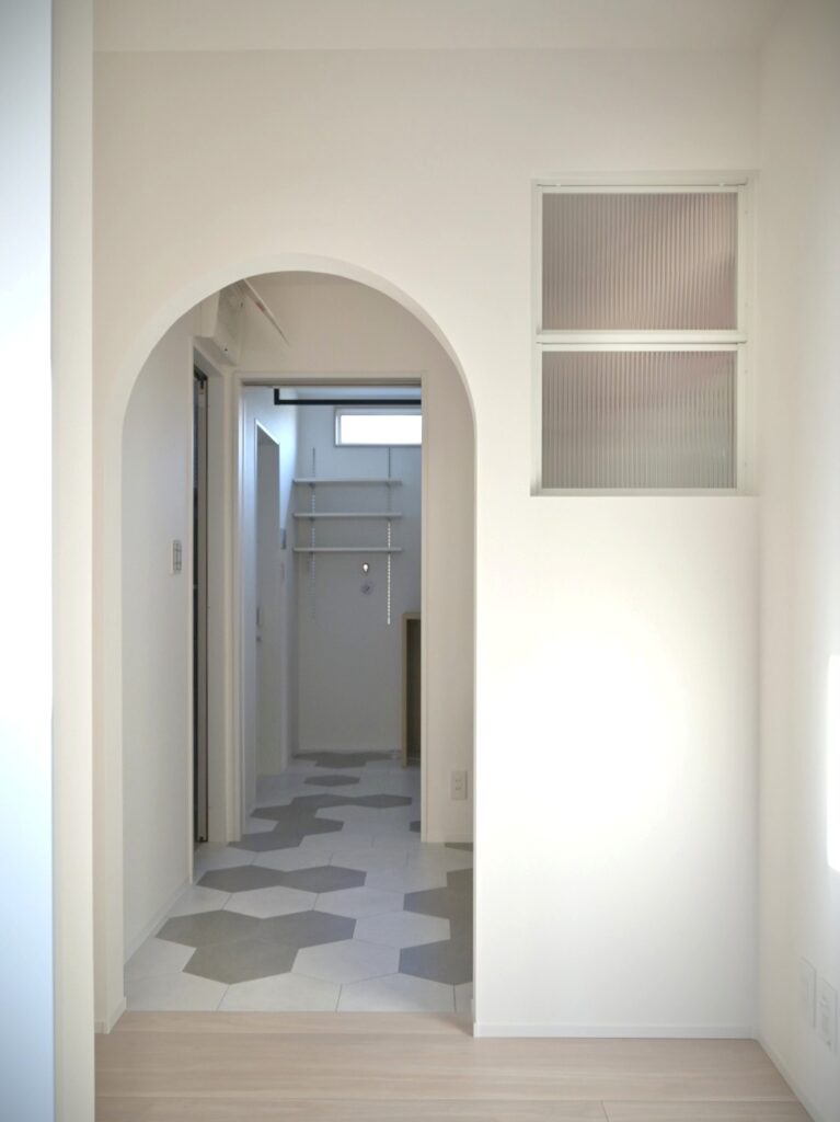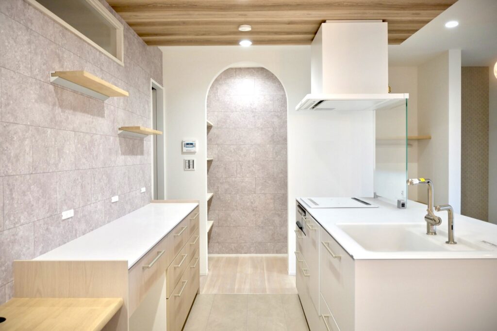 キッチン横のパントリーはアーチ壁でゆったり区切りを