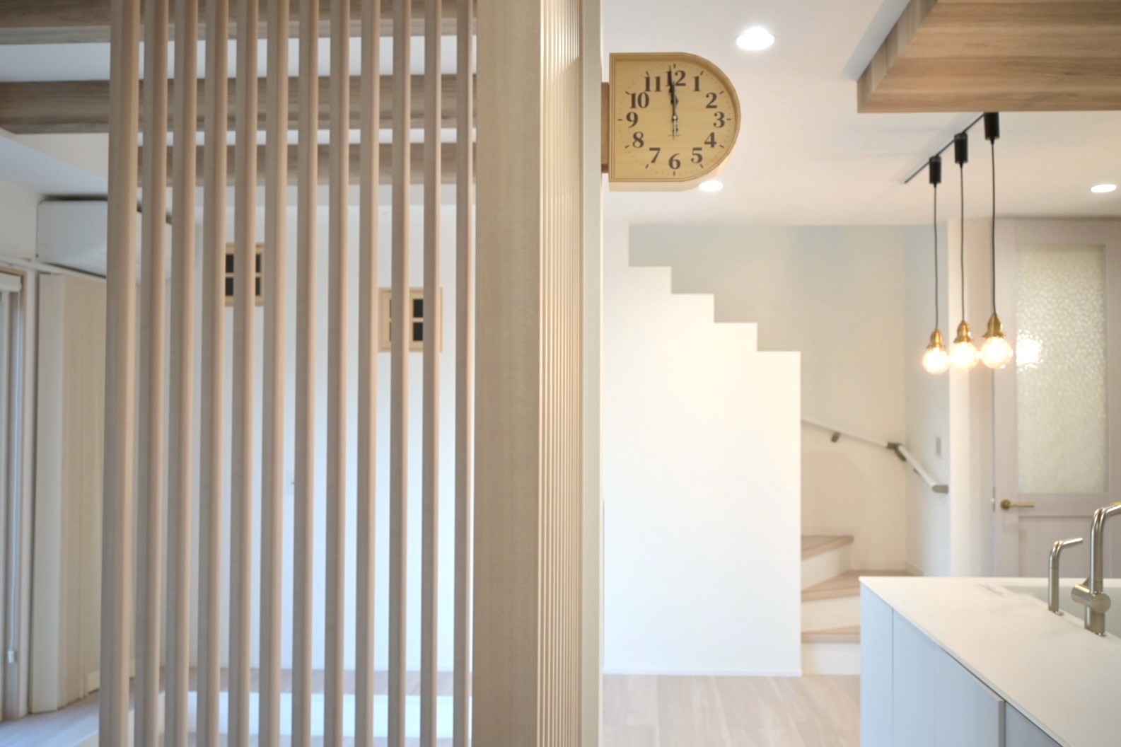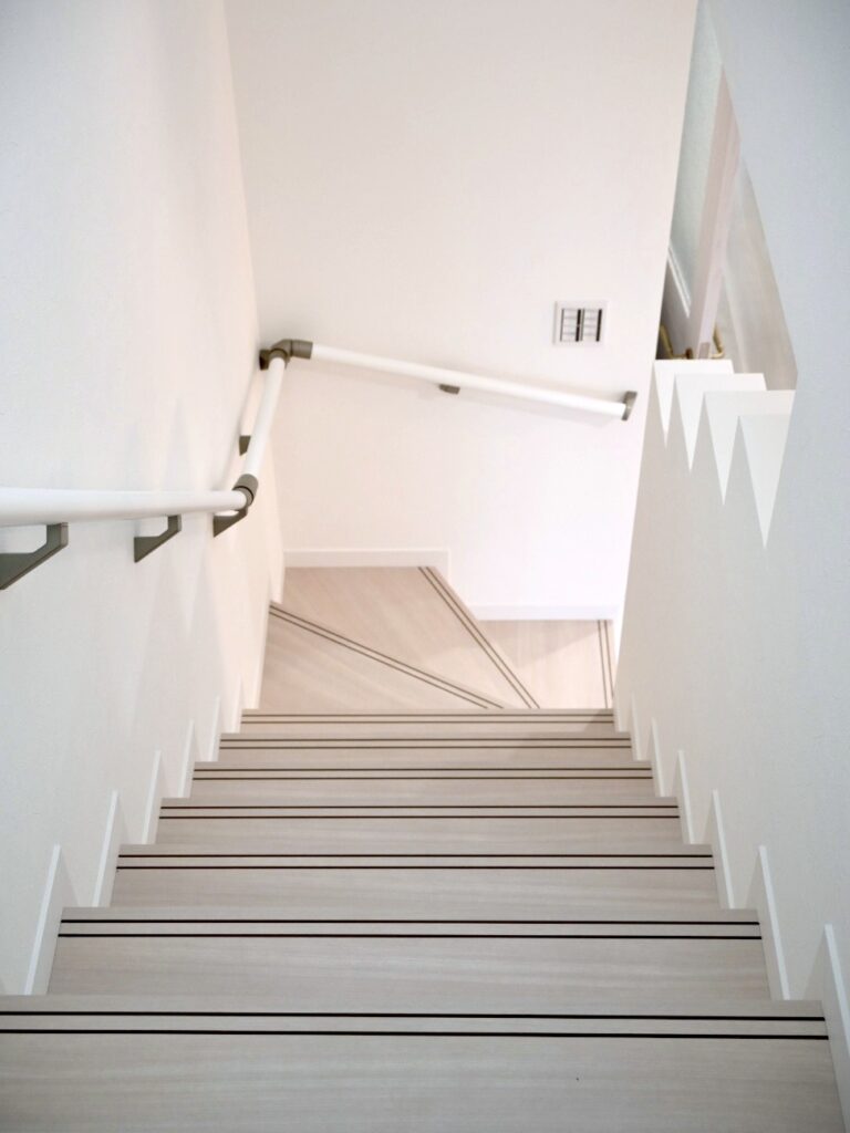 階段の手すりもホワイトにまとめ、清潔感とかわいらしさを