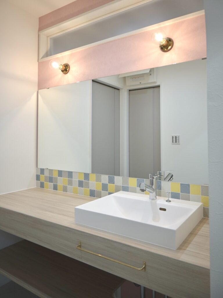大きな鏡と洗面台で大人二人が並んでも余裕があります