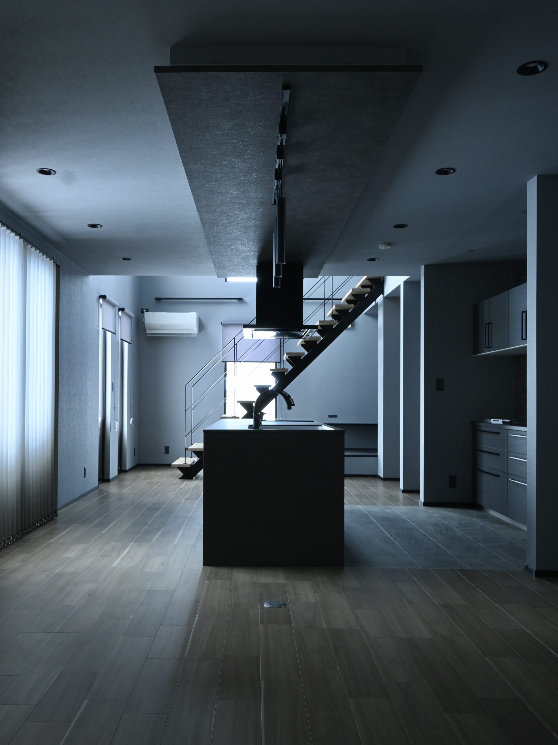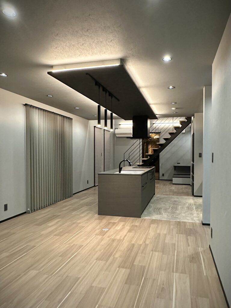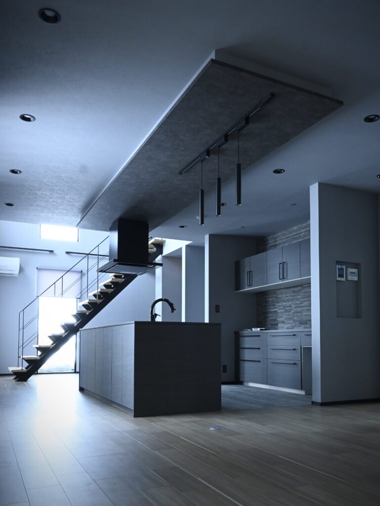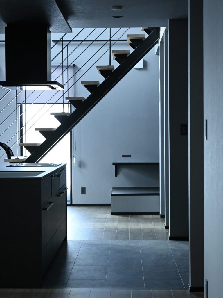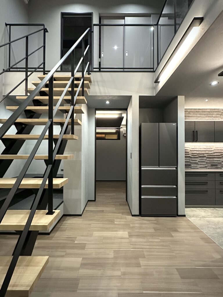 間仕切りのない開放的な大空間にLDKがつながり、開口からの光によって浮かび上がる階段のシルエットがカッコよさを際立てます。