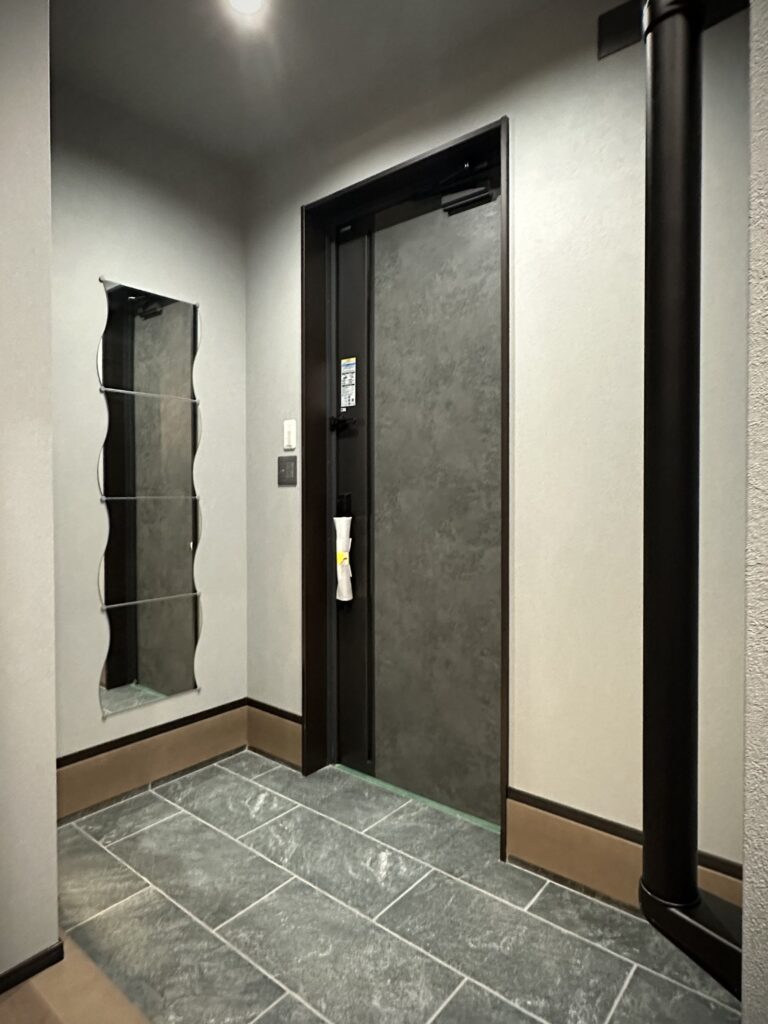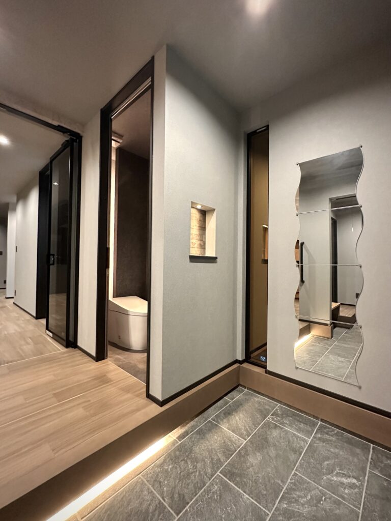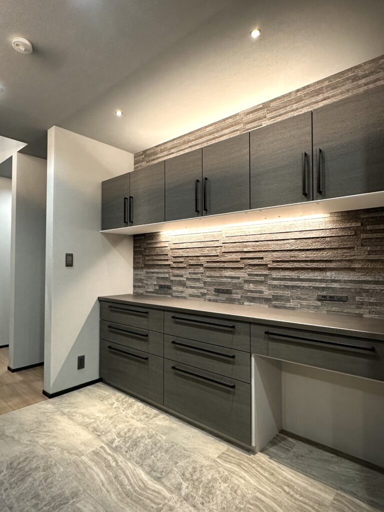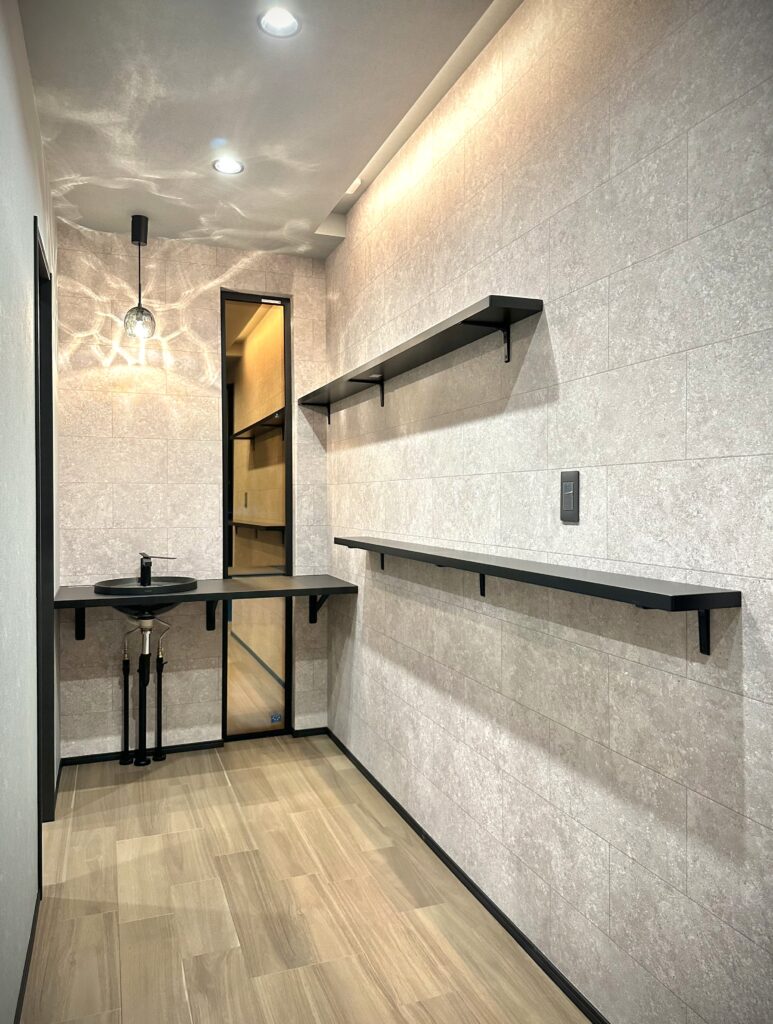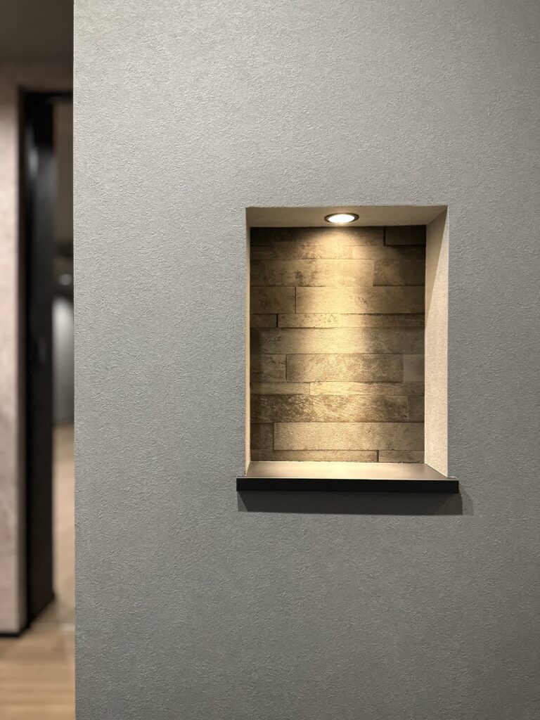 『大人かっこいい』を極めた内装は調湿効果のあるエコカラットをアクセントに、施主様お好みのグレーをベースにした生活感のないホテルライクな印象に仕上がりました。