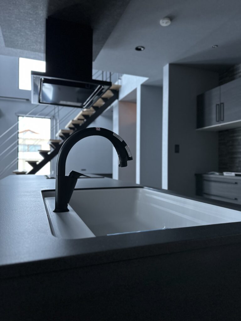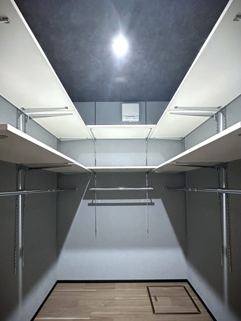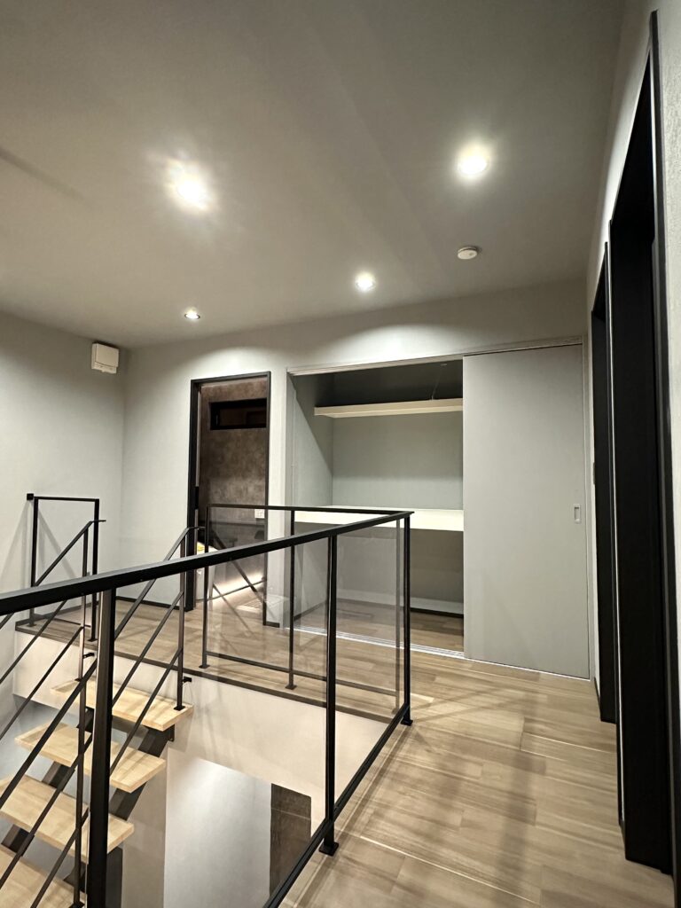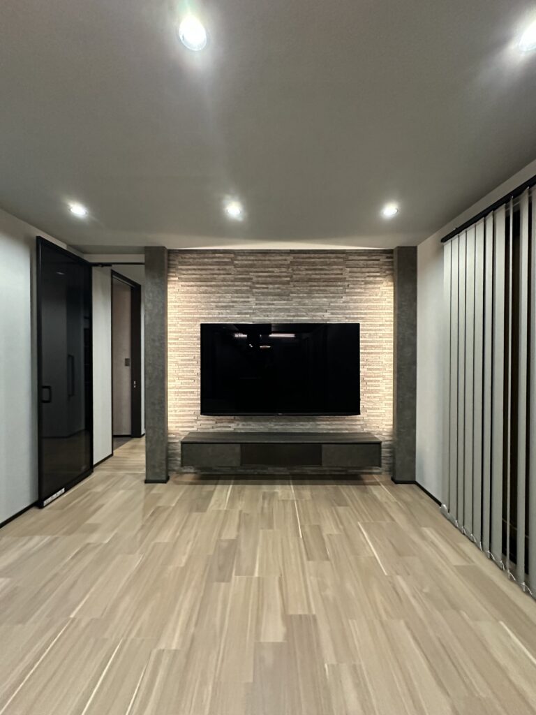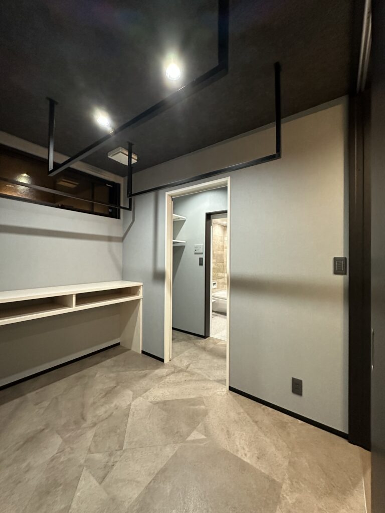 『大人かっこいい』を極めた内装は調湿効果のあるエコカラットをアクセントに、施主様お好みのグレーをベースにした生活感のないホテルライクな印象に仕上がりました。