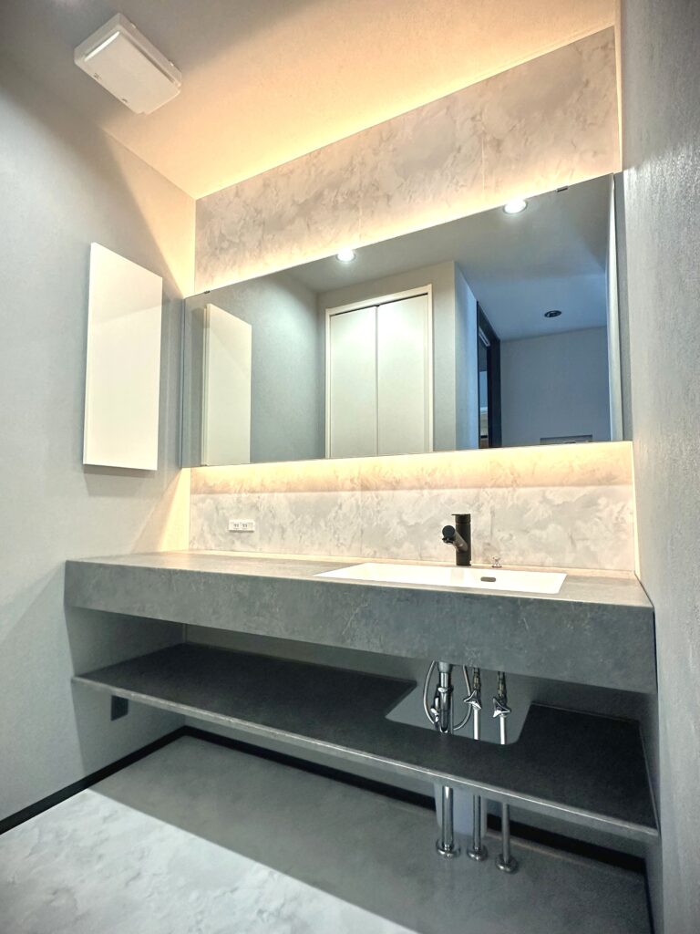 大理石調と間接照明の組み合わせが高級感を漂わせる洗面スペース