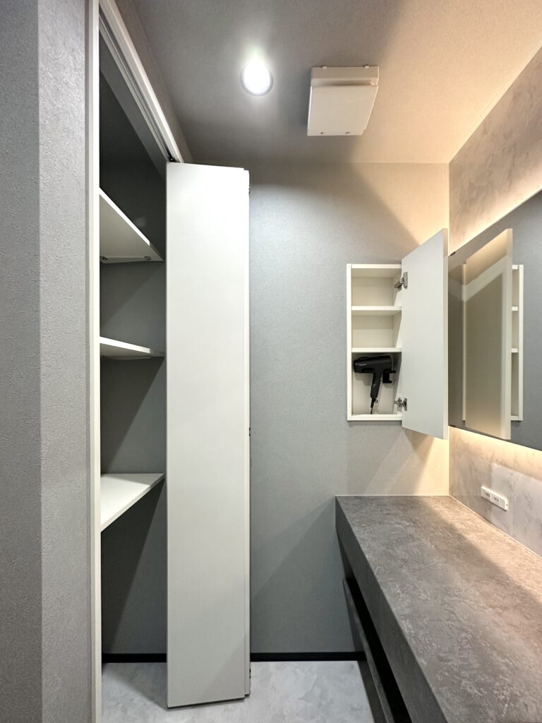 ドライヤーのコードまで入る埋め込み収納で見た目もすっきり