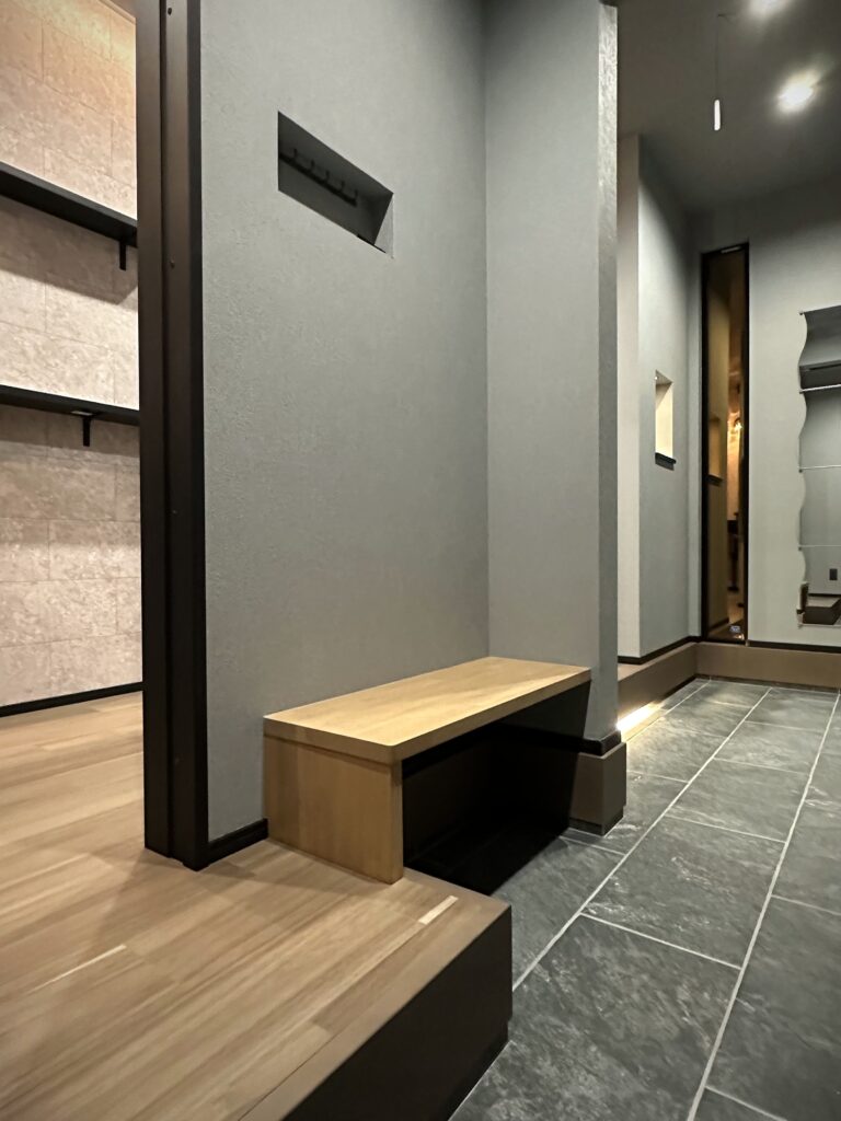 エントランス奥には小さなベンチを設置