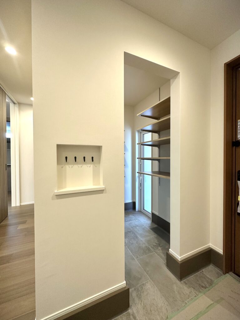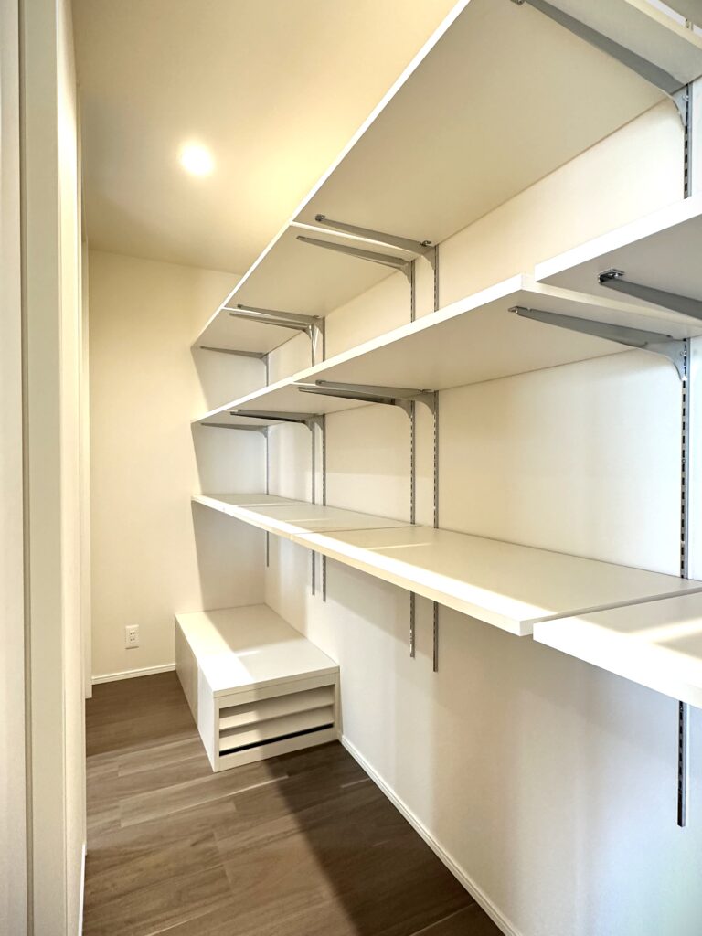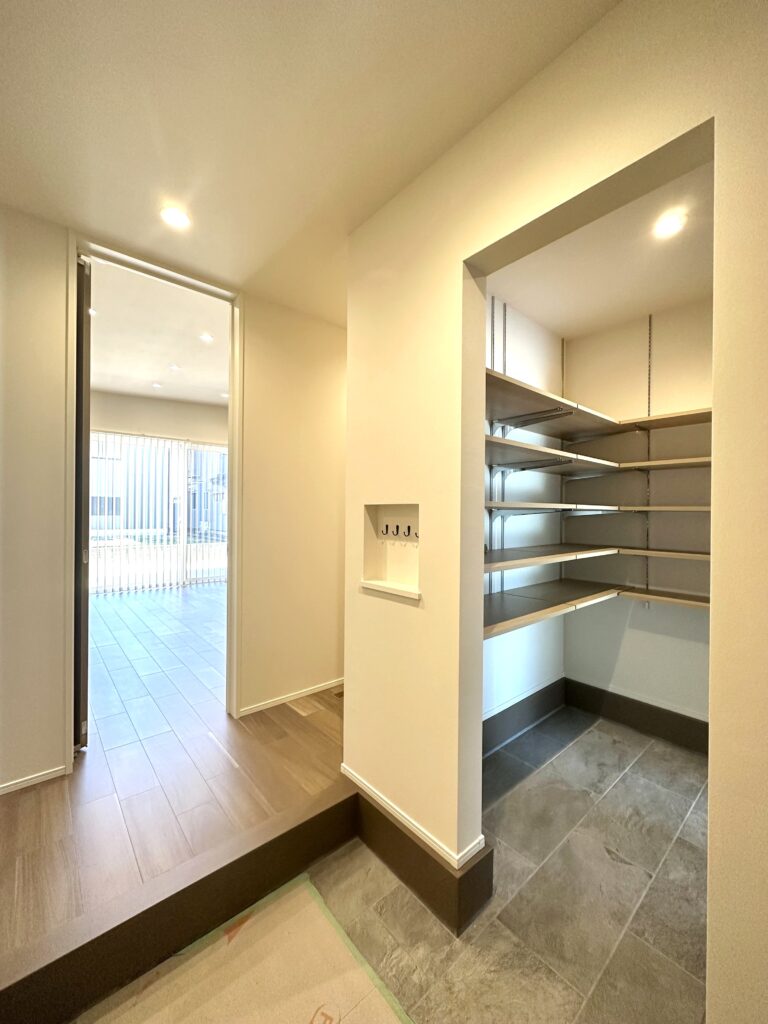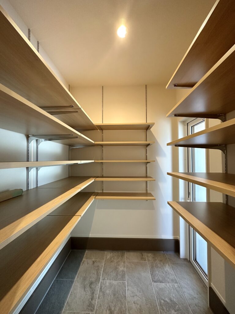 パントリーは出入り口を二つ設けたことで、ペニンシュラキッチンでも回遊できる動線を実現